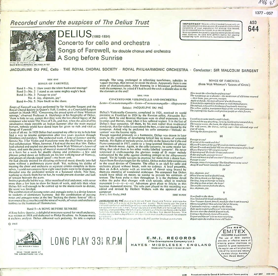 商品コード:1377-057[HMV] J.デュ・プレ(vc)/ ディーリアス:告別の歌, 夜明け前の歌, Vc協奏曲