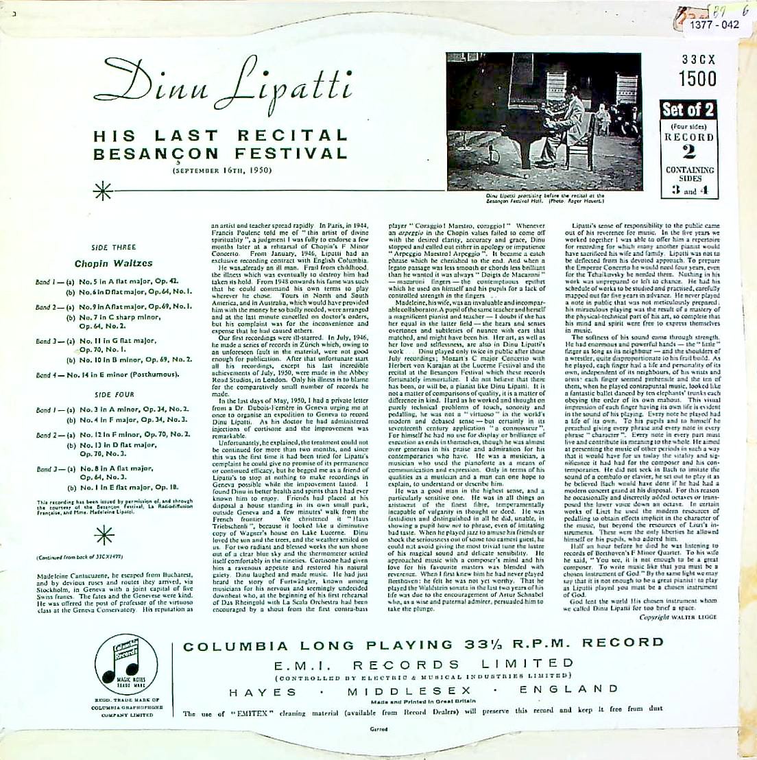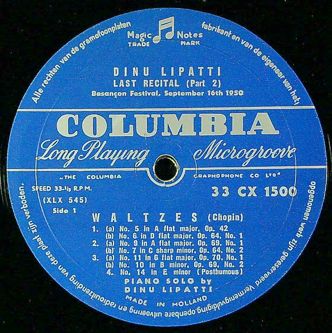 商品コード:1377-042n[COLUMBIA] D.リパッティ(pf) / ブザンソン最後のリサイタル-2/ショパン:13のワルツ(2番なし)