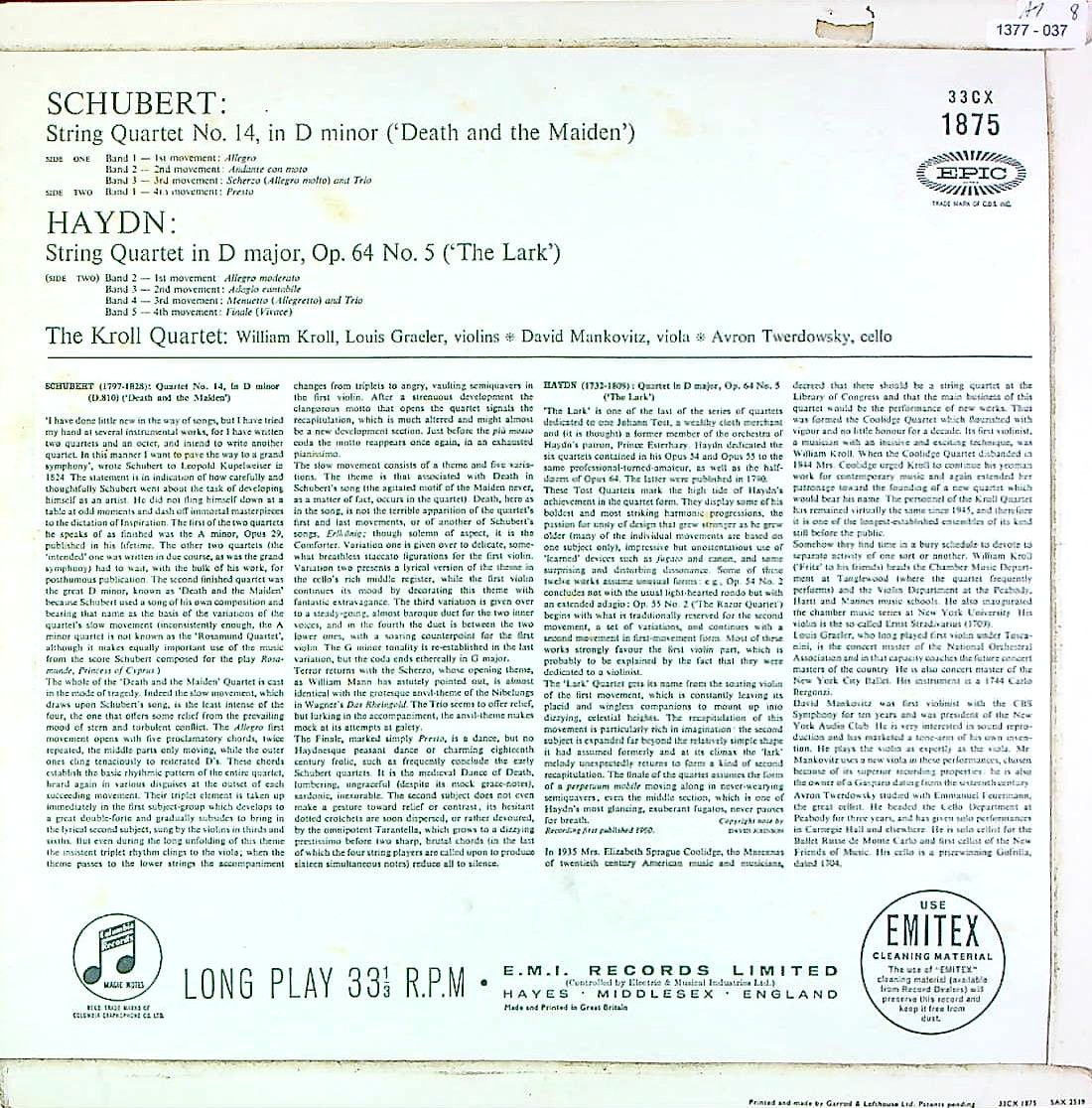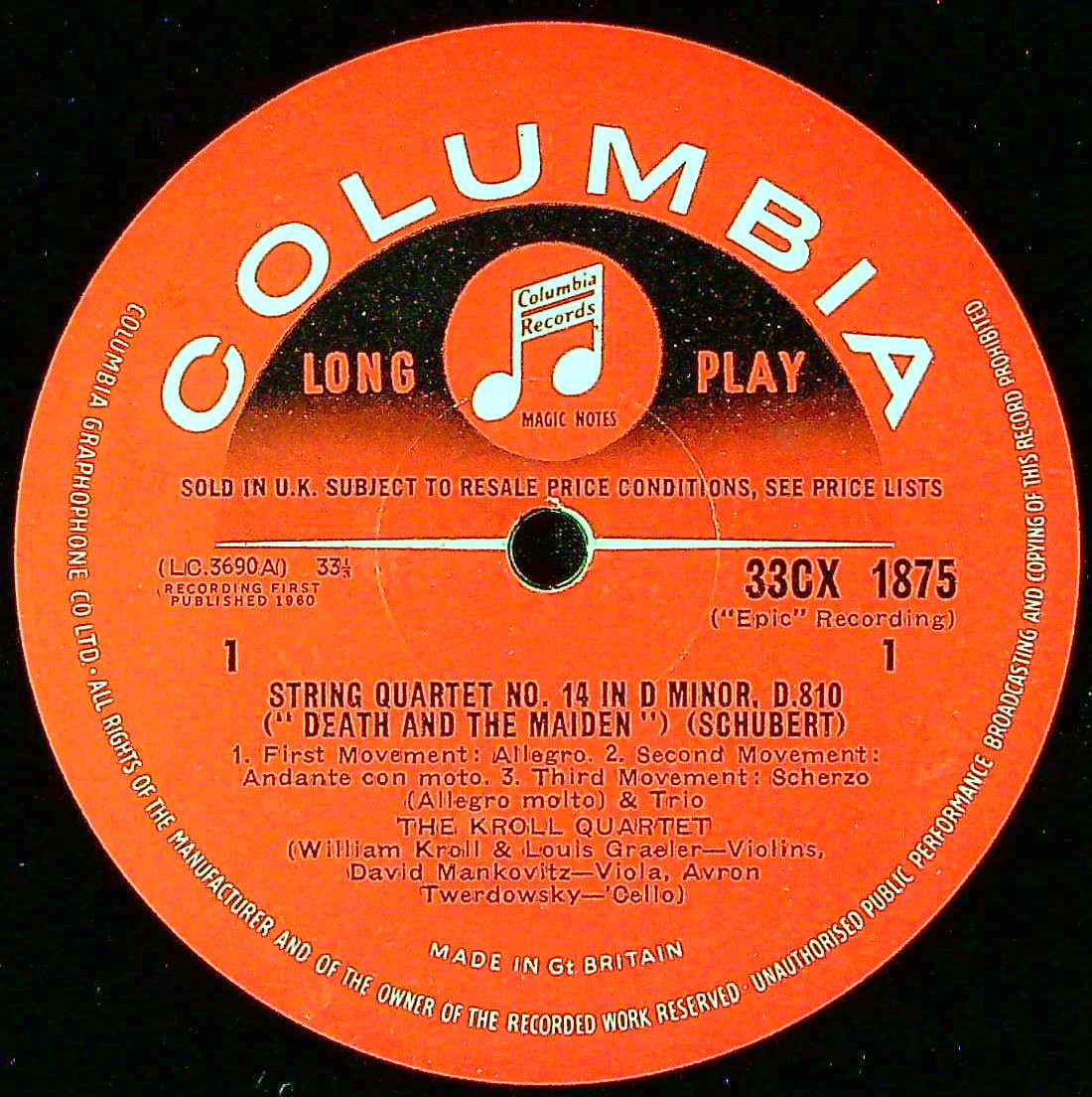 商品コード:1377-037[COLUMBIA] クロールQt. / シューベルト:弦楽四重奏曲14番「死と乙女」, ハイドン:弦楽四重奏曲第67番「ひばり」