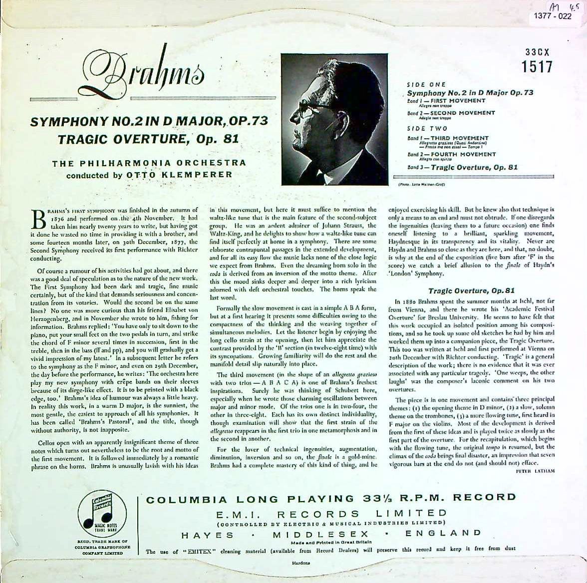 商品コード:1377-022[COLUMBIA] O.クレンペラー/ ブラームス:交響曲2番Op.73, 悲劇的序曲Op.81