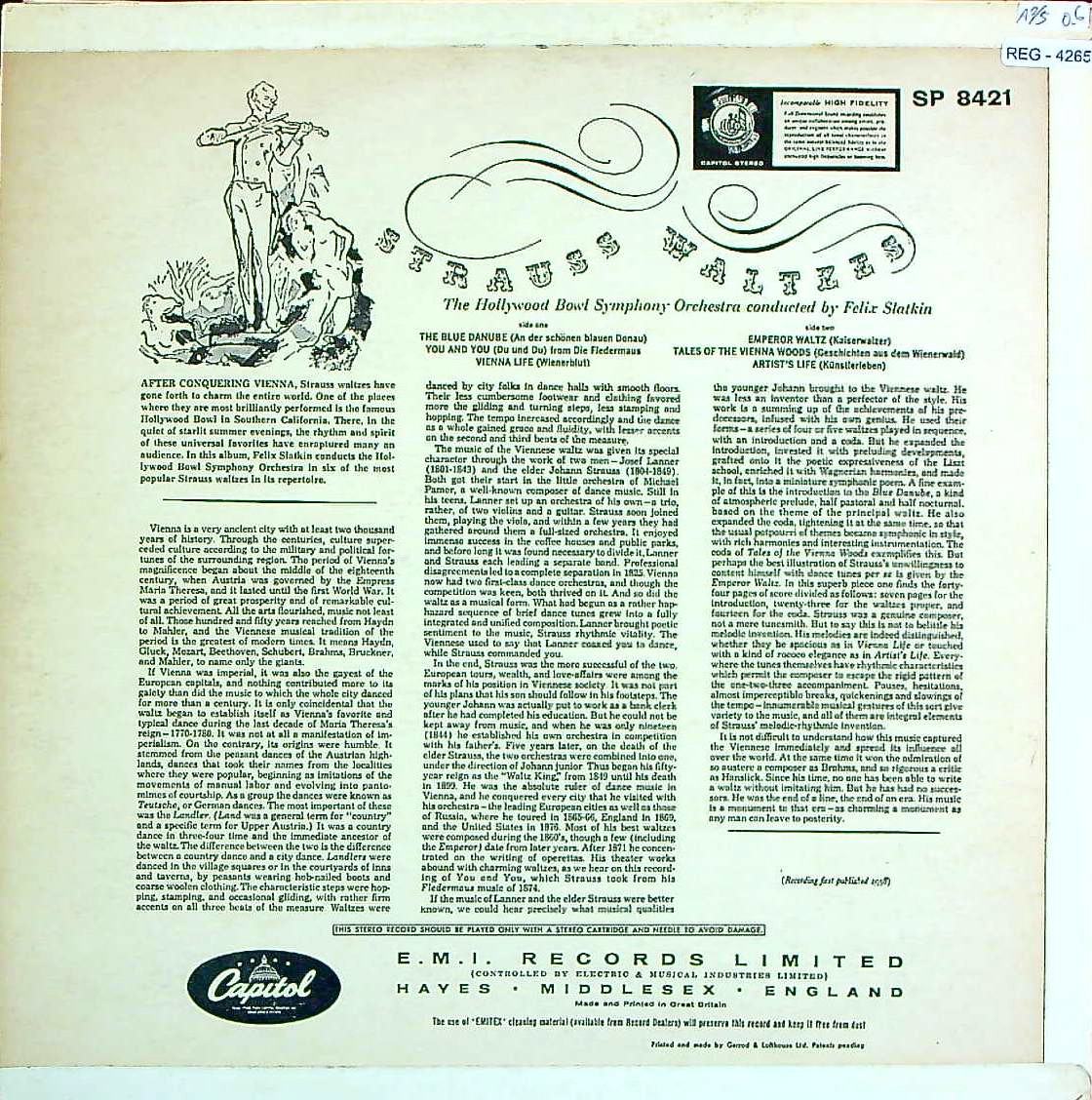 商品コード:REG-4265[仏CAPITOL] F.スラットキン/ J.シュトラウス:ワルツ集/皇帝円舞曲, ウィーンの森の物語, 芸術家の生活, 美しく青きドナウ 他全6曲