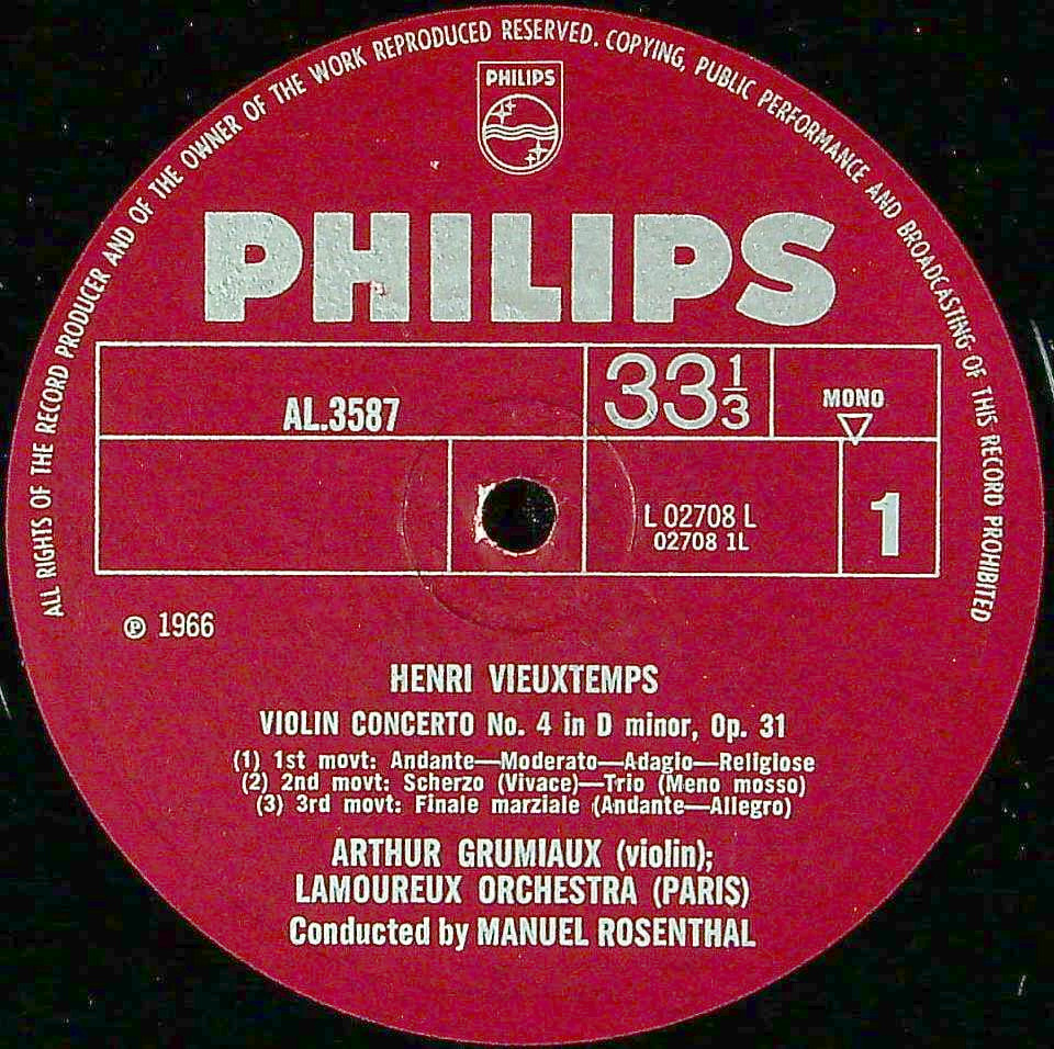 商品コード:1380-055[PHILIPS] A.グリュミオー(vn)/ ヴュータン:Vn協奏曲4番Op.31, ショーソン:詩曲Op.25, ラヴェル:ツィガーヌ