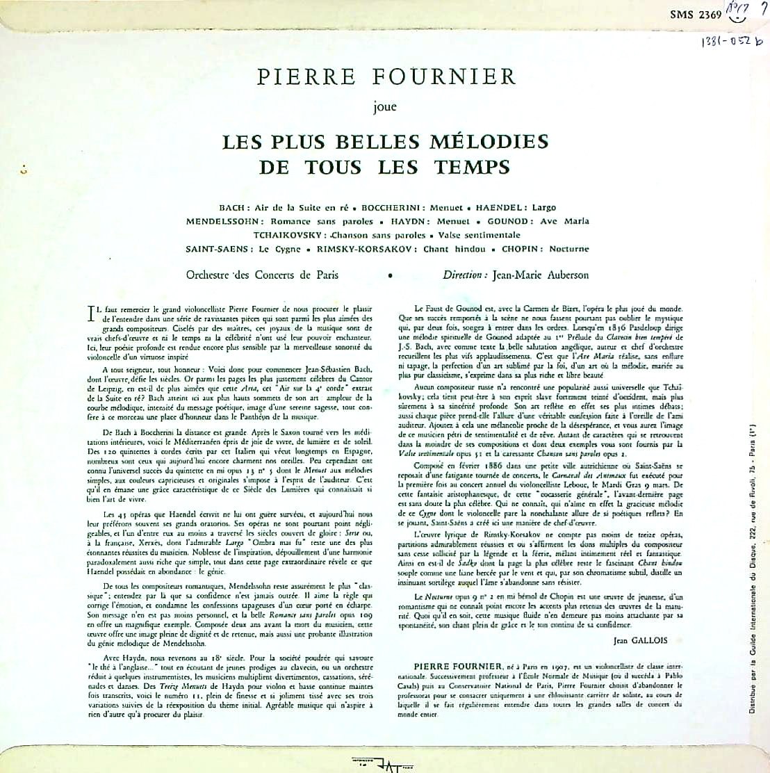商品詳細:フルニエの小品は最初、英COLUMBIAに2枚、DECCAに1枚あり、人気は高く、3枚とも相当に高額(モノラル)。この1964年にモノラル/ステレオで録音されたCHS系は音質も非常に良く、フルニエの雄大なチェロが響く。オケ伴奏は初めての試み。オケは伴奏に徹していてフルニエのジャマにならない。選曲も良く、フルニエの代表的小品集といえる。1曲目のバッハ・アリアが断トツに素晴らしく、ヘンデルのラルゴもチェロで弾かれた最高ランク! ピエール・フルニエ(1906 - 1986)はパリ生まれのチェロ奏者。弟のジャンはヴァイオリニストである。12歳でパリ音楽院へ入学してポール・バズレールとアンドレ・エッキングに師事した。1927年にはコロンヌ管弦楽団のソリストとして迎えられ、フランス各地およびヨーロッパ各国での演奏活動を開始した。1956年以降はジュネーヴに住み、演奏活動の拠点とした。なんといってもフルニエを有名にしたのは1960年にArchiv Produktionに入れたバッハ:無伴奏Vc組曲の全曲録音だろう。1940年代のSP録音から始まり、1950年代のDECCA、Columbia、1960年頃からのDGG/Archiv Produktion、1970年代ERATO、RCA等様々なレーベルに録音を残したが、中でもConcert Hall系への録音は特殊である。1960年代のM.オーベルソン指揮パリ・コンセールo.とのオーケストラ付き小品集が最初の録音である。同じ時期にドレル・ハンドマン(pf)とのチェロ・リサイタルも存在する。1978年にはシューマンの室内楽を録音。1978年にはConcert Hall系列の Festivalレーベルにバッハ:無伴奏Vc組曲の2回目全曲録音を行った。点数は少ないが重要な録音ばかりで、中でもこのオーケストラ付き小品集はフルニエの長い録音歴の中でも初めての曲集となる。ピアノ伴奏の小品集はDECCAとColumbiaのモノラル期にあったがオーケストラ付きはこれが唯一となった。オケはジャン=マリー・オーベルソン指揮パリ・コンサート管弦楽団(パリ・コンセールo.)。このオケは1828年から1967年まで活動したフランス初の交響楽団。1967年以降、楽団はパリ管弦楽団として活動を継続している。パリ音楽院のフィルハーモニック協会が運営し、音楽院の教授陣とその生徒で構成されていた。パリ音楽院管弦楽団と同じではないが下部組織のような関係かと思われる。1967年に新設されたパリ管弦楽団はオーディションを経て、108名の音楽家(内50名はパリ音楽院管弦楽団出身)が選抜された。正確にはパリ音楽院管弦楽団とパリ・コンサート管弦楽団の混成である。ジャン=マリー・オーベルソン(1920- 2004)はスイス生まれの指揮者。1950年から1951年にかけてケルンでギュンター・ヴァントに指揮法を師事し、1956年から1960年にかけてはエルネスト・アンセルメとカール・シューリヒトに師事した。1951年スイス・ロマンド管弦楽団の第2指揮者として1956年まで在任。1962年から1968年までザンクト・ガレン交響楽団の指揮者、1968年から1973年まで、ハンブルク州立歌劇場でフランス・レパートリーとバレエの指揮者を務め、 1972年から1975年までバーゼル放送交響楽団の指揮者を務めた。パリ・コンサート管弦楽団には客演のようである。Concert Hall系列としてはパリ音楽院管弦楽団は無理としてもパリ・コンサート管弦楽団との共演はかなり頑張ったと思われる。内容は流石に素晴らしく、フルニエの最盛期の上品で伸びやかなチェロの音が存分に味わえる。Concert Hall系列でなければ出来なかった録音かもしれない。フランス語タイトル「Joue Les Plus Belles Mélodies De Tous Les Temps」は直訳で「史上最も美しいメロディーを演奏」。