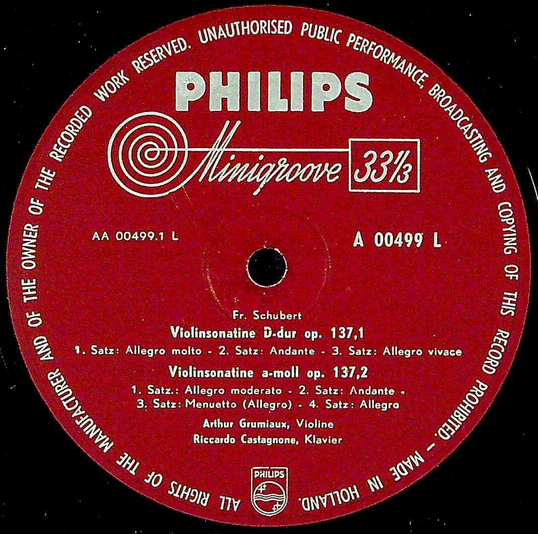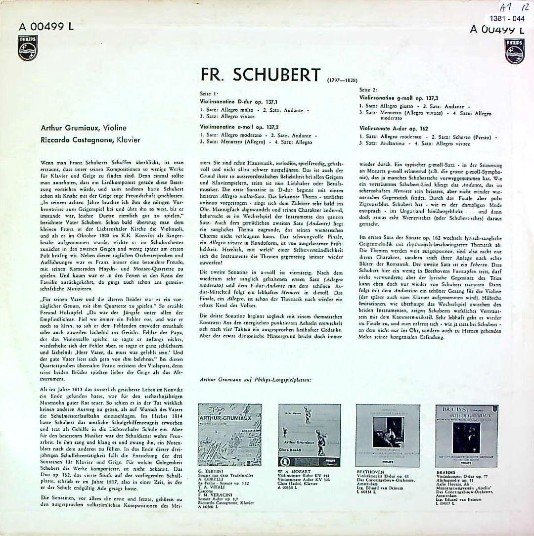 商品コード:1381-044[PHILIPS] A.グリュミオー(vn)/ シューベルト:Vnソナチネ1~3番Op.137, 二重奏曲D.574