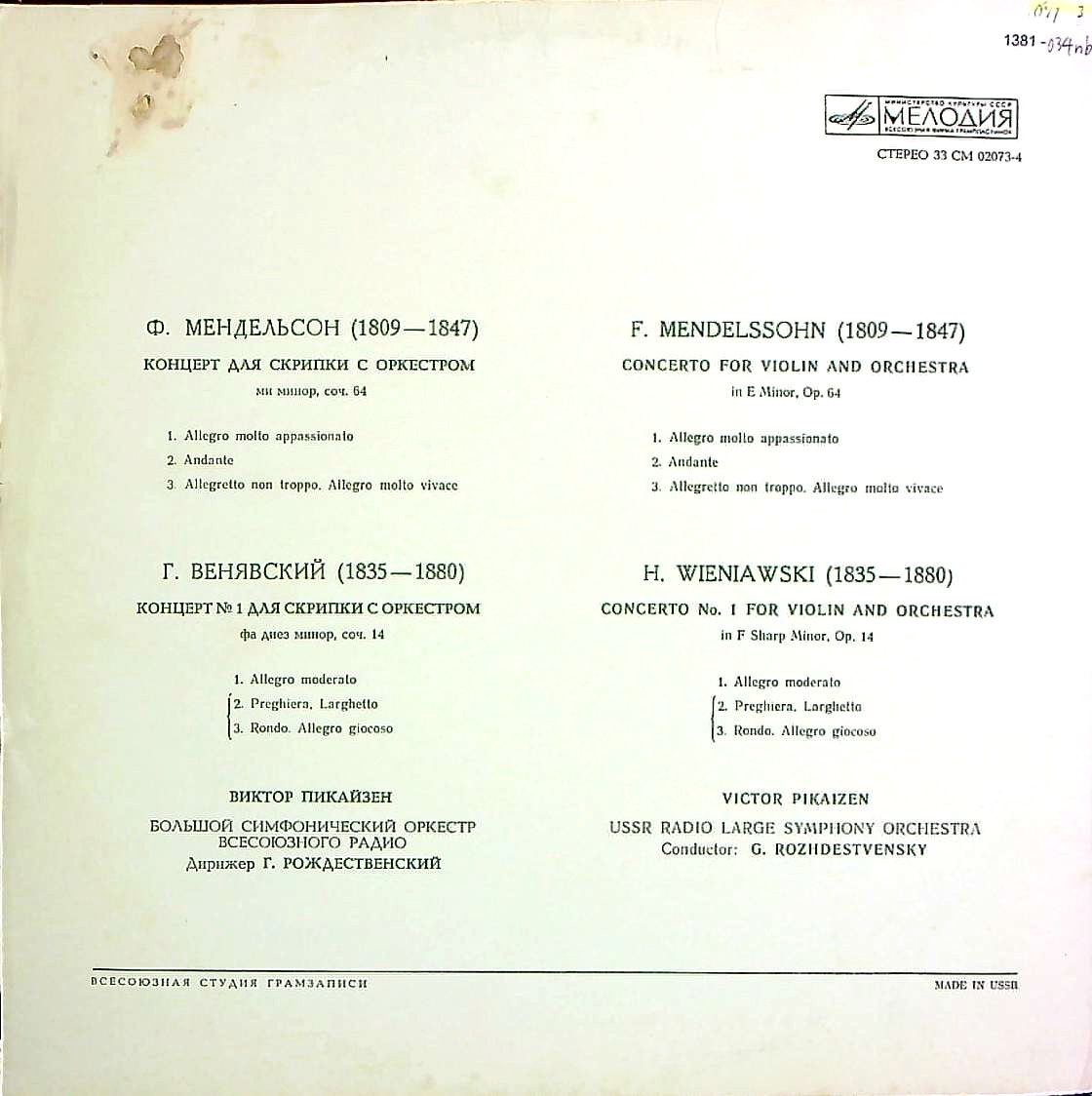 商品コード:1381-034nb[MELODIYA] V.ピカイゼン(vn)/ メンデルスゾーン:Vn協奏曲Op.64, ヴィエニャフスキ:Vn協奏曲1番Op.14