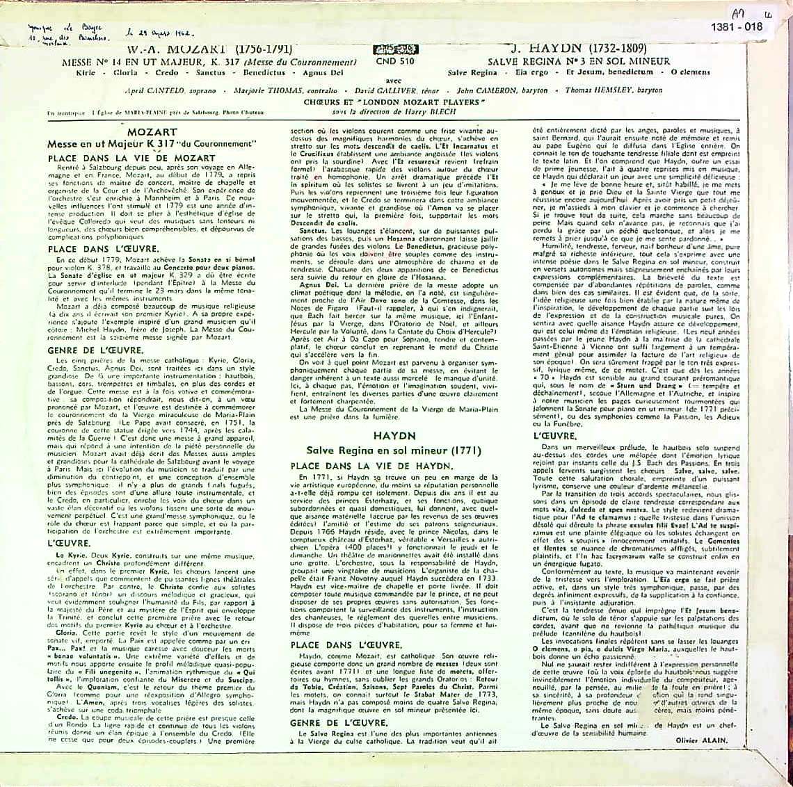 商品詳細:His Master's Voice:CLP 1031で発売された比較的よく知られたモーツァルトの戴冠式ミサK.317の録音で英国での最初の録音と思われる。オケと合唱はハリー・ブレックが創設したロンドン・モーツァルト・プレイヤーズとその合唱団。モノラル期の名演の一つである。英国録音とは言えしっかりラテン語で歌われる。K.317の陰に隠れたハイドンの「サルヴェ・レジーナ」に注目する方は多くないだろう。これはK.317のおまけとしては重要過ぎる1曲である。「サルヴェ・レジーナ」は聖歌の一つである。厳密には「アンティフォナ(交唱)」という聖母マリアへの祈りの一つ。ハイドンの「サルヴェ・レジーナ」は5曲あり、これはその中の2番目のト短調 でHob.XXIIIb:2が付く。ハイドンのミサ曲は14曲ありHob. XXIIが付くが、「サルヴェ・レジーナ」はミサ曲とは異なるジャンルである。「小規模な宗教音楽群」に使われるHob.XXIIIbが使われる。録音の少ないマイナーな宗教音楽だが「サルヴェ・レジーナ」ト短調はB面全て使う長い曲で初めて聴いても心打たれる美しい曲である。前奏曲は指揮者により異なるが、じきにに始まる合唱は男女混声で静かながら「戴冠式ミサ」に負けない魅力を持つ曲である。あるいはこちらが主役かもしれない。ジャケットには「サルヴェ・レジーナ」3番の表記があるが、現在では使用されない番号である。「戴冠式ミサ」の名演は多いが、「サルヴェ・レジーナ」ト短調の録音は少なく、当H.ブレック盤こそが今もって名演と湛えられるLPである。ドラマティックな表現と緻密なアンサンブルで高く評価されている。1980年代にニコラウス・アーノンクール指揮 コンツェントゥス・ムジクス・ウィーンも録音したが古楽スタイルで全くの別物。ブレック盤は定番のK.317と決定盤の「サルヴェ・レジーナ」の両方が楽しめる超お得盤!フランス盤は特に希少!