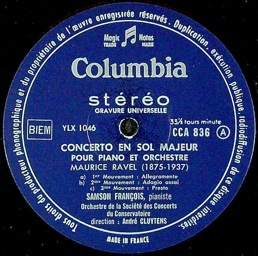 商品詳細:久しぶりの入荷になるS.フランソワ(pf)A.クリュイタンス指揮パリ音楽院o.によるラヴェル:Pf協奏曲、左手のためのPf協奏曲。仏ステレオ初出はSAXF 136で発売され、その後同じ棒付ボードSAXF 836というレコード番号に変わる。その後'70年代まで再版される事になる名盤。改めて聴いてみてフランソワの素晴らしさを思い知らされた。ペルルミュテル、アルゲリッチ、ミケランジェリ等の名演もあるが、一つを選ぶとしたら当盤で決まりだ。文句なしの決定盤!最も有名なフランソワの録音でラヴェルの協奏曲の手本のような洒落っ気タップリの演奏。英国人やドイツ人が死ぬほど頑張ってもこういう演奏はできやしない。ソロだけでなくオケがクリュイタンス/パリ音楽院o.というのも成功の重要な要素だろう。きっちりしていてはラヴェルではない。砕けすぎては一時の共感のみで終わる。自由奔放なのに曲として完成度が高い。これが名演の最大のポイントだろう。二人の共演はそのバランスをしっかり押さえて、いかなる新しいスタイルをも凌駕する時代を超越した演奏である。純クラシックピアニストで曲が持つジャズ的なフィーリングをしっかり出せる人は多くない。不摂生がたたり46歳で早死にしたフランス人天才ピアニストはフランスで最も愛された。ドイツは彼を退廃の象徴とみなしたのか1枚たりとも発売しなかった。プレスの種類は多く、聴く方法は多数あるが、どうせステレオで聴くなら1960年代の仏COLUMBIAレーベルで聴きたい。1968年頃からCVB 836になり自動的にLa Voix De Son Maîtreからの発売となる。仏COLUMBIAレーベルは1960年代中~後期に廃止されLa Voix De Son Maîtreに統一される。英国も似たような経過を辿った。この録音は人気が高く多くの種類でステレオ盤が存在する。SAXF 136→SAXF 836→CCA 836→CVB 836→1970年頃CVL 836→1972年頃2C 069-10867--と変遷する。価格は年代と盤質が反映される。SAXF 136で盤質7以上なら44.000円はする。それを基準に価格体系を形成している。再版が必ずしも価値がないとは言えない。相応の価値があり、それぞれの年代で再版の新品が定価で売られていた。それを考えるとある程度の年代の再版でも決して高額とは言えない。2020年代のレプリカ新譜の価格をみれば、決して高額ではない。