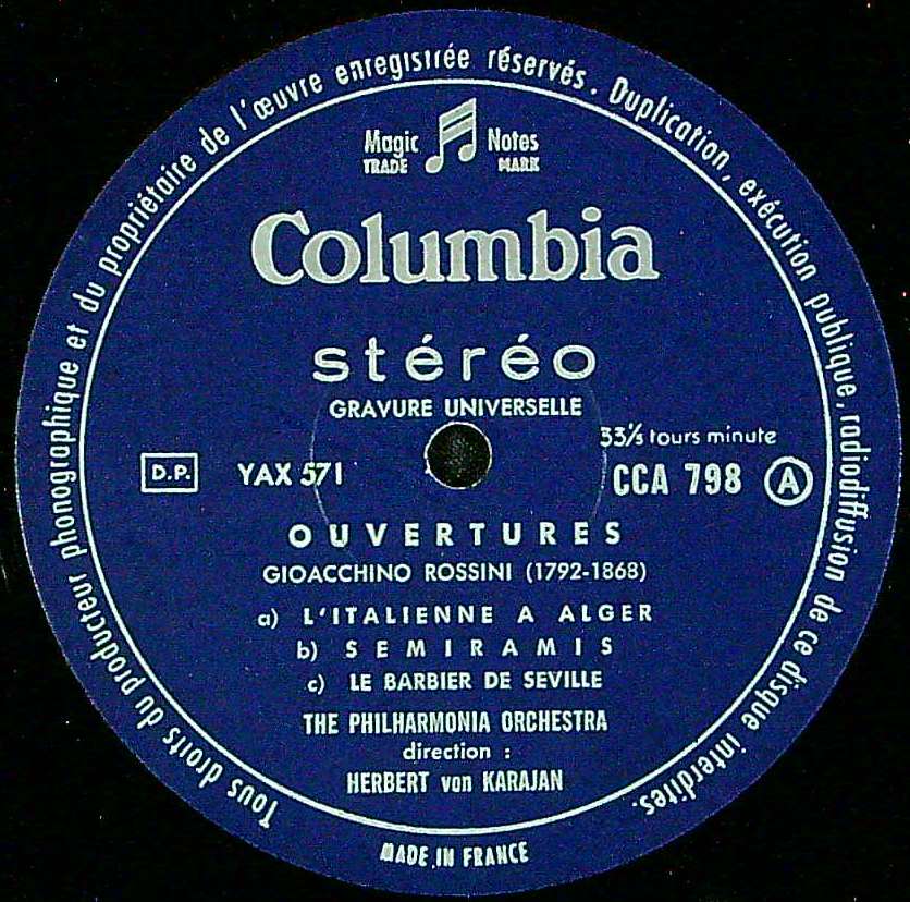 商品詳細:ジュベール工房の綺麗なデザインのジャケットに入ったSAXF/CCA。カラヤンの中でもこれは案外プレスが少ない。フィルハーモニアo.の甘さと軽やかさがよく出た演奏でストレスなく楽しめるはず。ジャケットも保存状態が良い。金色のステレオシール付き。この仏プレスはかなりレア!カラヤンは何度かロッシーニ:序曲集を録音しているが、この初回録音であるフィルハーモニアo.との録音は意外なほど優れた録音である。今となってはさほど特別感はないかもしれないが、これだけのクオリティの高い録音をさほど根を詰めたリハーサルなしにやってのける才能は当時稀であり、次々と全く性格の異なる作品を録音してゆく技量に、何所のレコード会社も喉から手が出るほど欲しがった指揮者であることは理解できる。EMIの名プロデューサー、ウォルター・レッグが私財を投じて創設したEMIの為の録音専用のオーケストラであるフィルハーモニア管弦楽団は、当初音楽監督を置かず、1948年にはクレンペラー、フルトヴェングラー、カラヤンの3人を相次いで定期公演の指揮者とし運営していたが、フィルハーモニアo.との良好な関係を構築したかに見えたカラヤンは、1955年にベルリン・フィルハーモニー管弦楽団の首席指揮者に就任してしまい、その後期待されたカンテッリが1956年に航空事故で急死したことで、リーダー不在の危機が囁かれたが、レッグは大戦後ポジションに恵まれなかった観のあるオットー・クレンペラーをトップに据えることを決断した。1955年当時カラヤンはまだEMIに籍が在り、ロンドンとベルリンを行き来していた。カラヤンは結果、フィルハーモニアo.と大変な数の録音を残したが、改めて聴いてみれば、それらのほぼ全てが名演と呼んでしかるべきクオリティを誇っている。中でもロッシーニ:序曲集のスムースさは目を見張るものがあり、後年DGGのベルリンpo.との再録音と比較すれば、それは明らかである。中でもフランス盤SAXF/CCAのすっきりした音質は特に素晴らしく、超高額になりつつあるASDのW/Gレーベルと比較して遜色がないばかりか飛び抜けてクオリティの高い音質である。