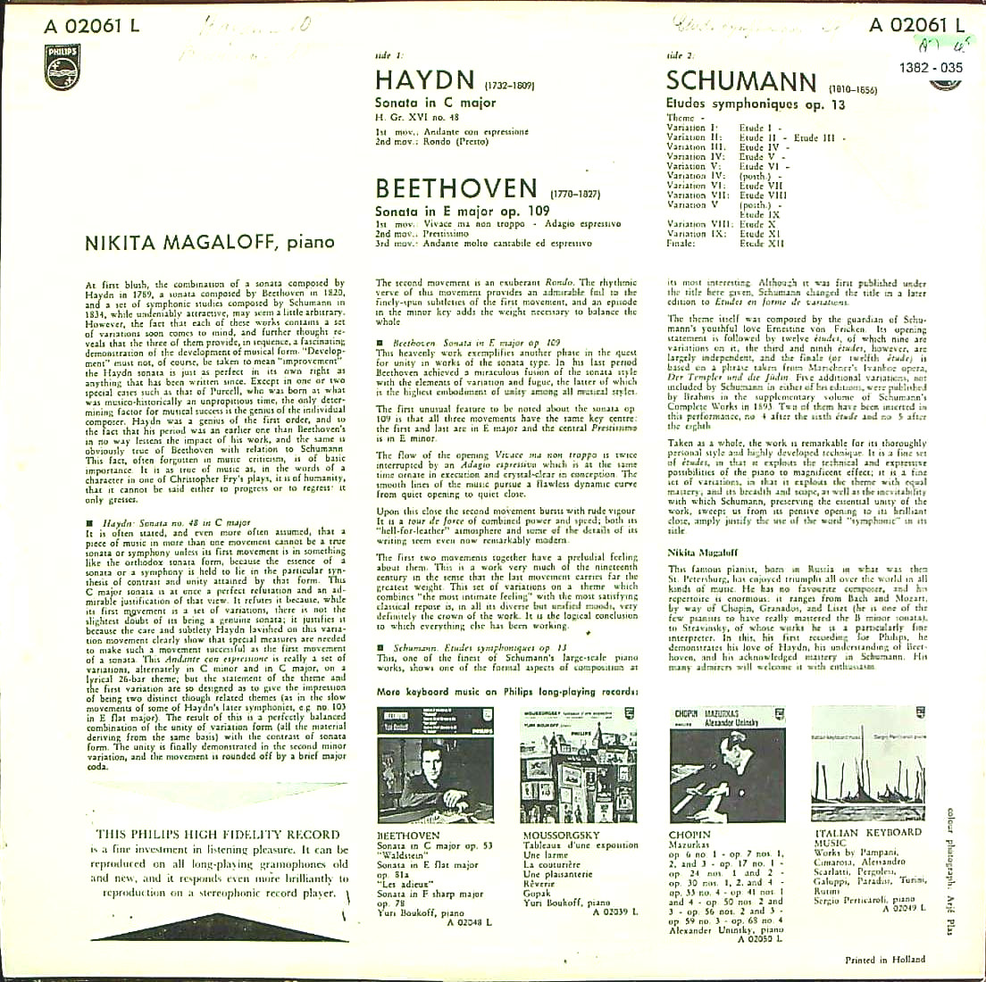 商品コード:1382-035p[PHILIPS] N.マガロフ(pf) / ハイドン:Pfソナタ第48番, ベートーヴェン:Pfソナタ30番, シューマン:交響的練習曲(全13曲)