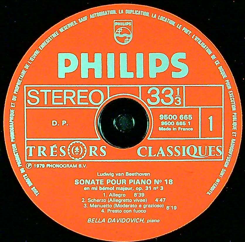 商品コード:1382-031[PHILIPS] B.ダヴィドヴィチ(pf) / ベートーヴェン:Pfソナタ18番Op.31-3, 14番Op.27-2「月光」, バガテル第25番WoO 59「エリーゼのために」
