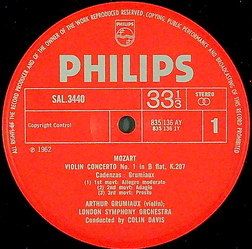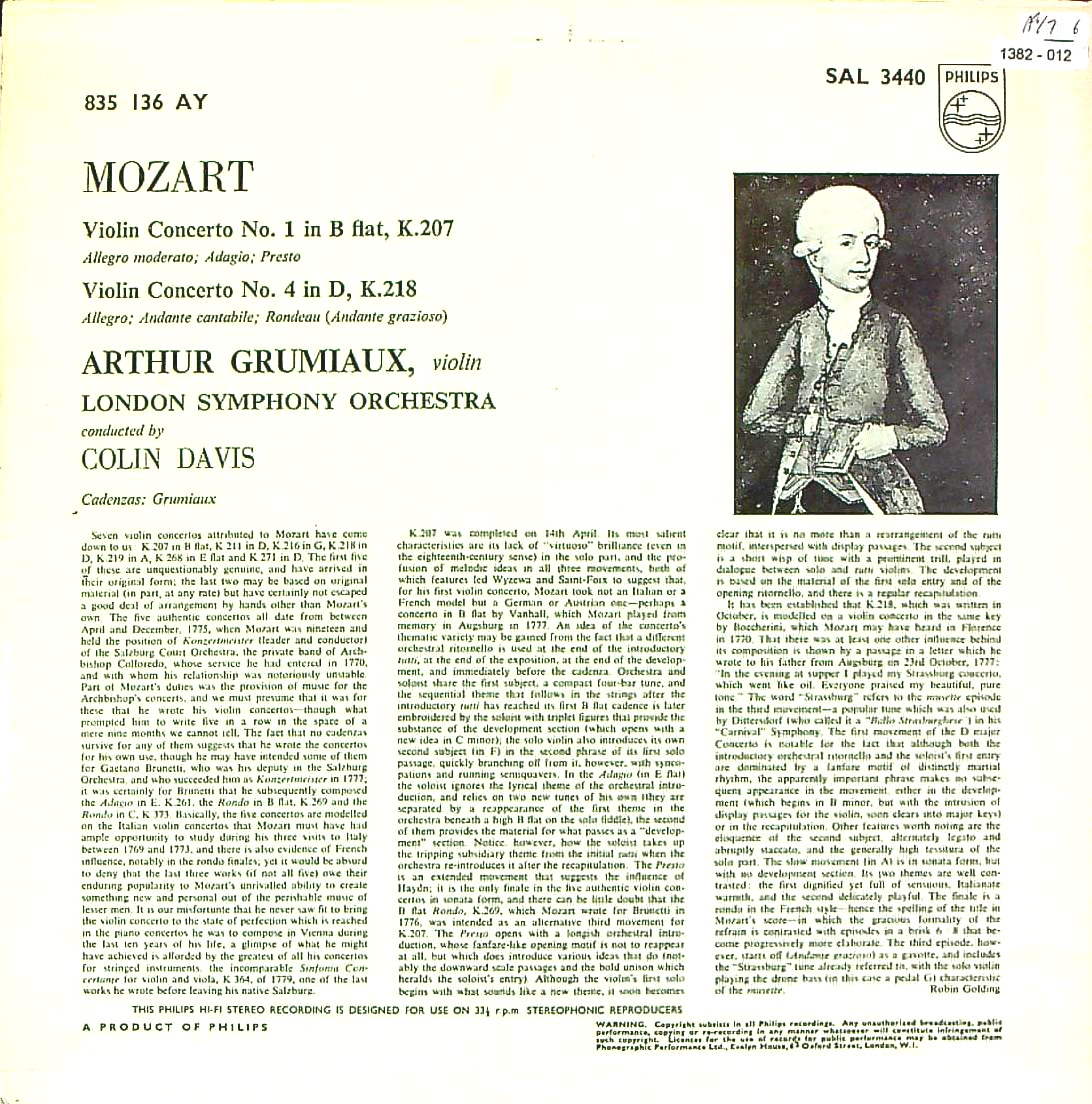 商品コード:1382-012[PHILIPS] A.グリュミオー(vn)/ モーツァルト:Vn協奏曲1番K.207, Vn協奏曲4番K.218