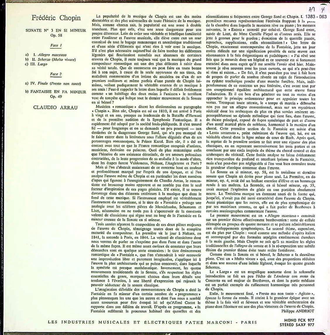 商品コード:1383-063[COLUMBIA] C.アラウ(pf) / ショパン:Pfソナタ3番Op.58, 幻想曲Op.49