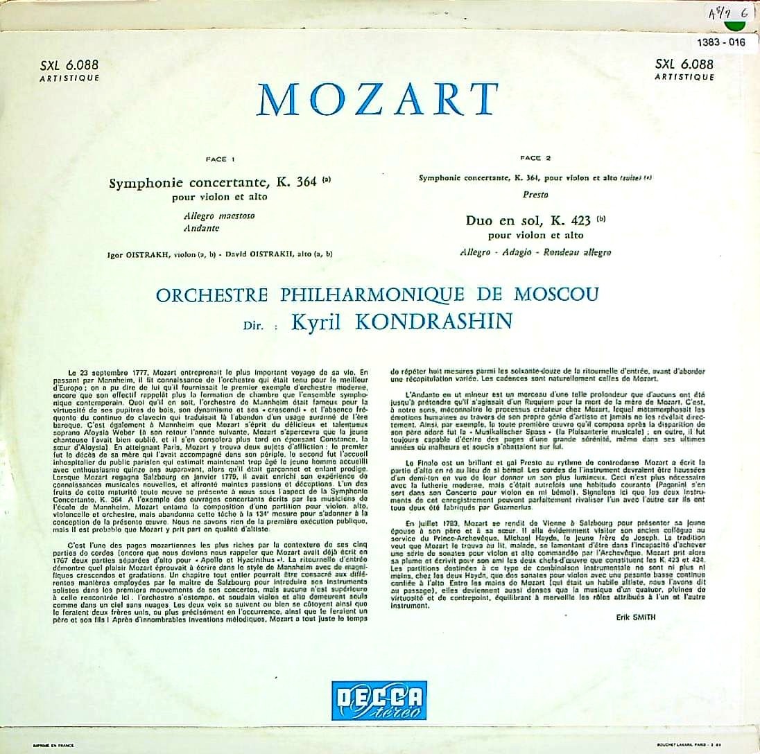 商品コード:1383-016[DECCA] I.オイストラフ(vn) D.オイストラフ(va)/ モーツァルト:協奏交響曲K.364, 二重奏曲1番K.423