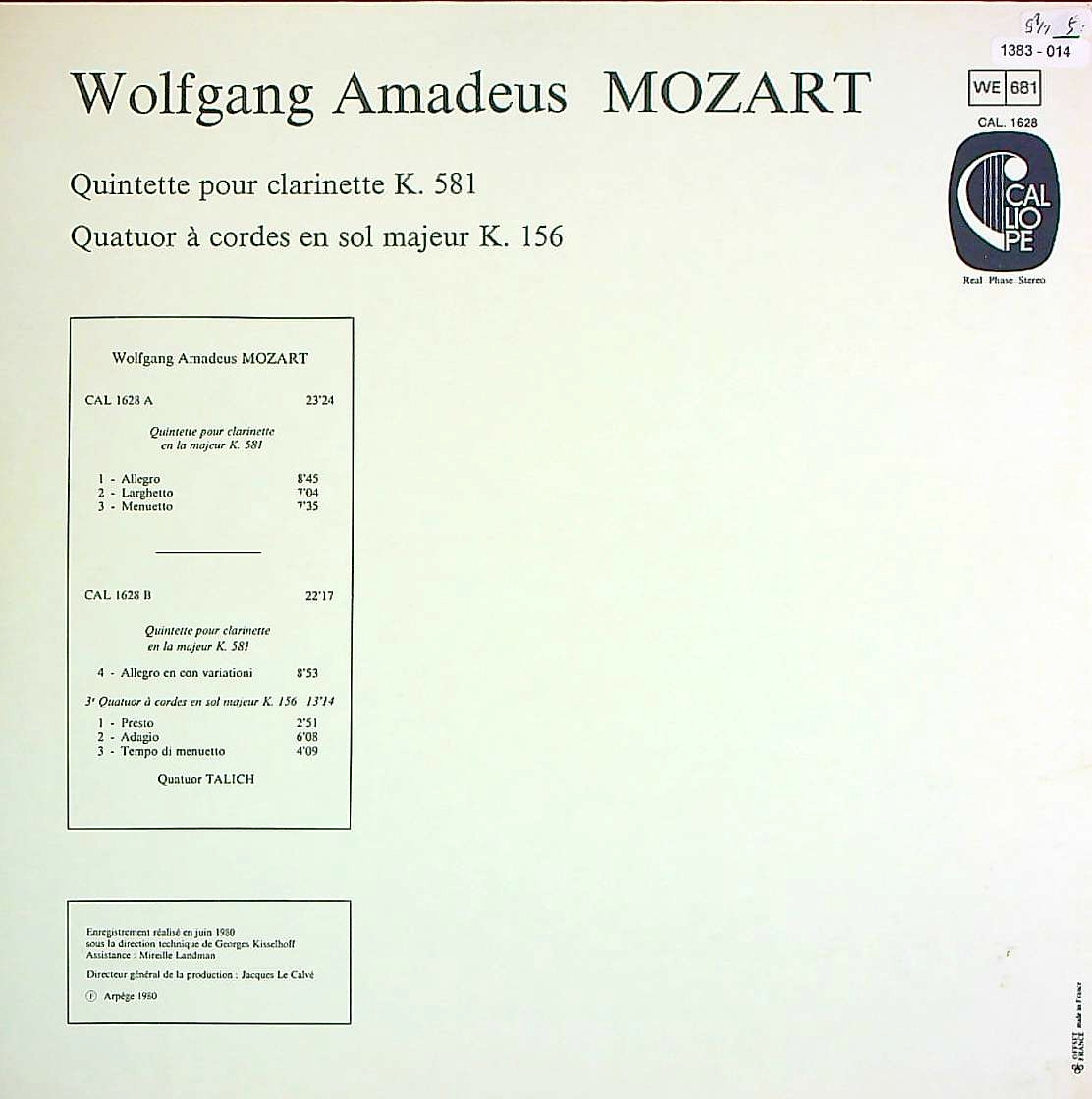 商品コード:1383-014[CALLIOPE] B.ザフラドニーク(cl) ターリヒQt. / モーツァルト:Cl五重奏曲K.581, 弦楽四重奏曲3番K.156