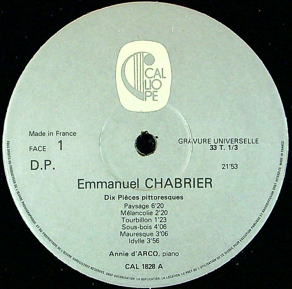 商品詳細:A.ダルコと言えば実に息の長い女性ピアニスト。'50年代より活躍を続けていたが、'70年代CALLIOPEでの数点の録音は、彼女がその独自の世界観を完成させて、花開いた時期と言えよう。シャブリエと言えばM.メイエルがまず頭に浮かぶが、ステレオではこの一枚が決定的に良い。フランスのエスプリを見事に音で表現し、花が匂い立つような妖しさもある。音質も文句なく良い。見開きジャケとバラ2枚の2種存在。どちらも盤は同じ。有名な牧歌(Idylle)は10の絵画風小品の第6曲で、このLPではA面最後に配置されている。かのタリアフェロもERATOに入れた人気の小品集に1曲忍ばせている。10曲通しで聴くことによりシャブリエの作曲した時点の心象風景が感じられれば幸いである。アニー・ダルコは持前の丁寧な演奏で独善に陥ることなく個性をやや抑えた説得力をもってキチンと描いている。テンポも良い。CAL 1828は前半のVol.1で連番のCAL 1829がVol.2となる。そこにはブレー・ファンタスク,即興曲,セポイの行進曲,エール・ド・バレ,遺作の5つの小品,カプリッチョが入る。2枚で揃うことでシャブリエのピアノ作品の殆どを聴くことができる。アニー・ダルコ( 1920- 1998)はフランス・マルセイユの生まれ。地元でアラン・マリオンの母親からピアノの指導を受ける。14歳の時にパリ音楽院に入学してマルグリット・ロンの下で研鑽を積み、1938年にプルミエ・プリを得た。しかし、第二次世界大戦の勃発により思うような演奏活動はできず、終戦後の1946年にジュネーヴ国際音楽コンクールのピアノ部門で2位入賞を飾って頭角を現した。アンドレ・ナヴァラなど大物ソリストの共演者としても度々マイナーレーベルに登場してきた。ソロ録音も多く、1950年代からL'OISEAU LYRE、ERATO、REM、APPROCHE、CLASSIC、SFP、PHILIPS、Pathé-とメジャーレーベル、マイナーレーベルに多くの室内楽、ソロ録音を残している重要なポジションを持つピアニストである。CALLIOPEでのサン・サーンスの全集録音では全てに参加しており、特にアンドレ・ナヴァラとはCALLIOPEで大半の曲を共演している。CALLIOPEはシャブリエ・ピアノ作品集を完全にアニー・ダルコに任せており、彼女のシャブリエ解釈への信頼の大きさを見せつけた。