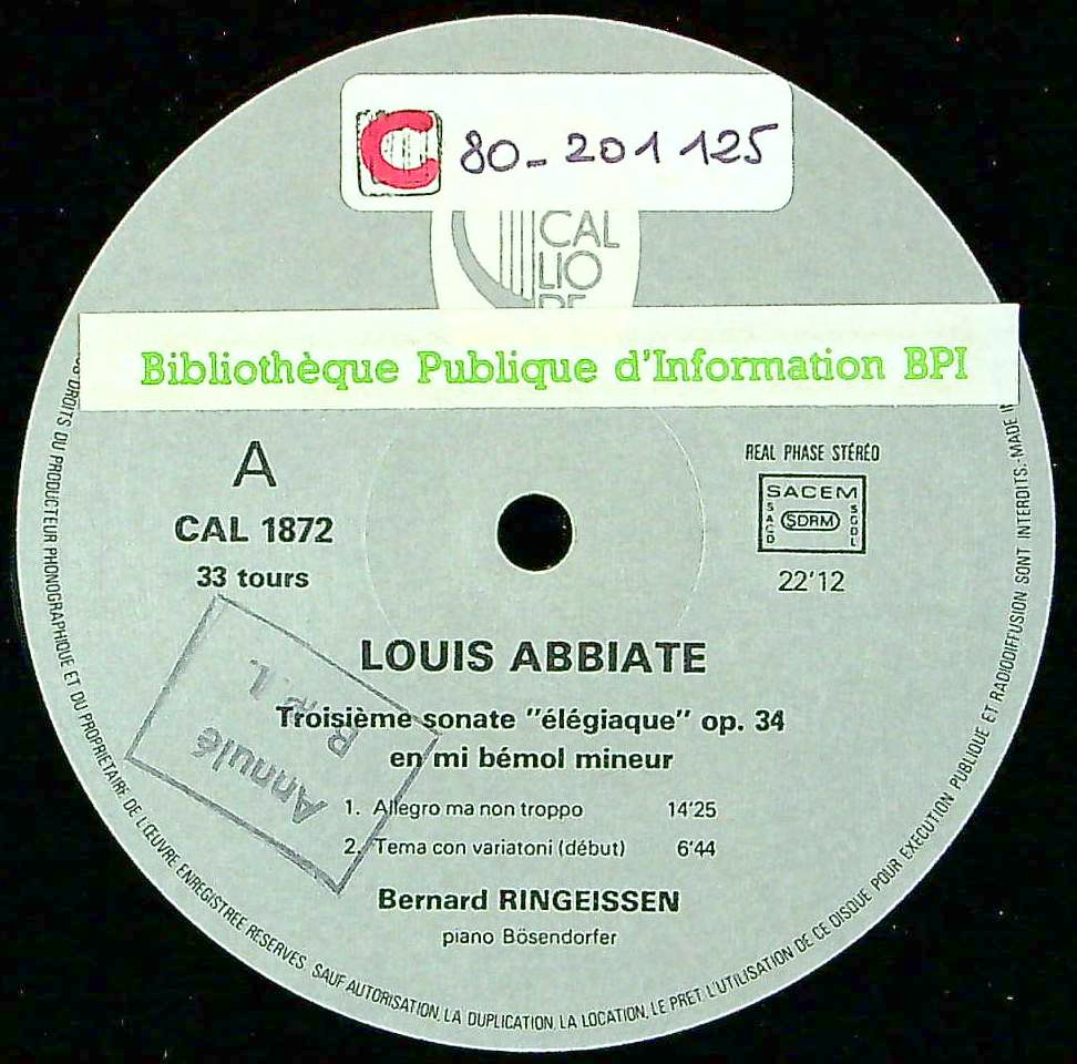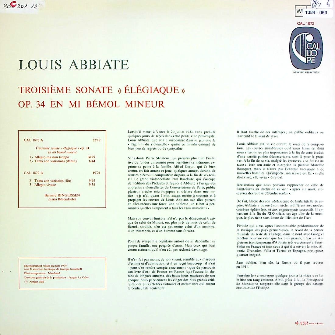 商品詳細:ルイ・アビアーテ・Louis Abbiate(1866-1933年)はモナコに生まれたチェリスト兼作曲家で、国際的には無名。 1879年にイタリアのトリノ音楽院に入学し、1882年にチェロと作曲で賞を受賞して卒業した。その年、彼はパリ音楽院に入学し、オーギュスト=ジョゼフ・フランショーム、そしてジュール・デルサールらの指導の下、チェロの訓練を完璧にこなした。1891年からオペラ=コミック座でチェロ奏者職に就き、 1894年までその職を務めた。 1900年代初頭には、アルトゥーロ・トスカニーニの指揮の下、ミラノ・スカラ座のオーケストラの首席チェロ奏者を務めた。1900年に『チェロのための全教本』を出版して教師として名声を博した。この為、彼は1911 年にサンクトペテルブルク音楽院からオファーされたチェロクラスの教授職を受け入れ、1919 年までその職を務めた。1895年に作曲したチェロと管弦楽のための協奏曲は、 1898年にパリで初演されたが大失敗に終わった。彼はピアノ曲(8つのソナタを含む)、オルガン曲、様々な編成の室内楽(2つの弦楽四重奏曲を含む)、メロディーや合唱曲、さらにオーケストラを使った作品など多くを作曲したが今日演奏されることは殆どない。ピアノ・ソナタは8番まであり、他14の前奏曲集、トッカータなどのピアノ作品がある。ルイ・アビアーテは、様々な成功を収めながら作曲に専念した。チェロ奏者であった為、チェロ作品が注目されがちだが、ピアノ・ソナタも近代作品としては極めて美しい曲ばかりである。全くというほど知られていない曲である。中でもピアノ・ソナタ3番は「Élégiaque」エレジアックの副題が付く曲。エレジアックとは、物悲しい、哀調を帯びた--という意味で変ホ短調の3楽章の曲でLP両面を使用する42分間の長い曲である。1979年録音で同時期にソナタ4/5番も録音されCAL 1873でリリースされた。ピアノのベルナール・ランジェサン(1934 -)はパリ生まれ。録音が多く、今では日本でもよく知られたピアニストである。12歳でパリ国立高等音楽院 に入学し、16歳でプルミエール・プリを獲得。マルグリット・ロンとジャック・フェヴリエ に師事。1953年、音楽コンクールに専念する為、一時的に公の場での演奏活動を引退。1954年、ナポリのアルフレド・カゼッラ・コンクールでセルジオ・スコペッリティと同率2位を獲得。同年、ジュネーヴ国際音楽演奏コンクールでも優勝。1955年、ワルシャワの第5回ショパン国際ピアノ・コンクールで4位を獲得。続いてロン=ティボー国際コンクールでディミトリ・バシキロフと同率2位を獲得(同年は1位は出なかった)。1962年、リオデジャネイロ国際コンクールで1位を獲得し、ブラジル音楽の解釈でヴィラ=ロボス特別賞を受賞した。 実力派である。リンガイセンを表記されることもあるが当社ではフランス語読みのランジェサンで統一している。カミーユ・サン=サーンスとイーゴリ・ストラヴィンスキーのピアノ作品全集で 国際的に知られる。アビアーテに興味を持った僅かな音楽家の一人として、この貴重な録音を大切にしたい。