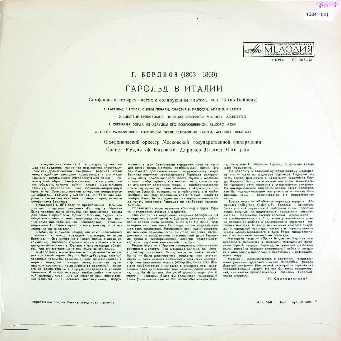 商品コード:1384-041t[MELODIYA] R.バルシャイ(va)/ ベルリオーズ:イタリアのハロルドOp.16
