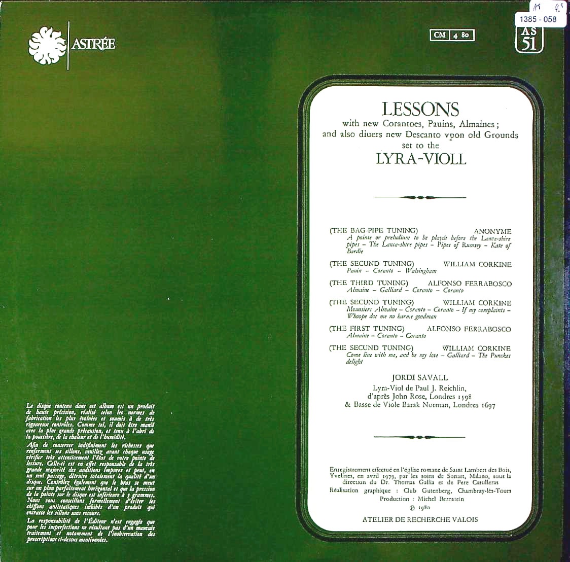 商品コード:1385-058[ASTRÉE] J.サヴァール/ リラ・ヴィオールのためのレッスン/A.フェッラボスコ, コーキン 他