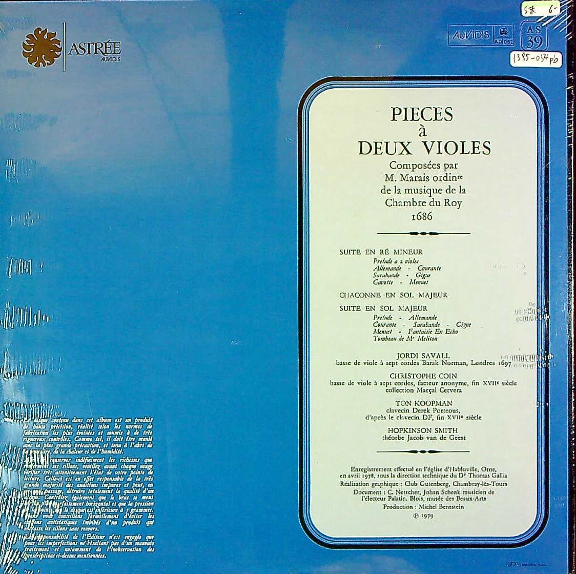 商品コード:1385-054pb[ASTRÉE] J.サヴァール(バス・gamb) 他 / マレ:ヴィオール曲集Vol.1/組曲ニ短調, シャコンヌ, 組曲ト長調