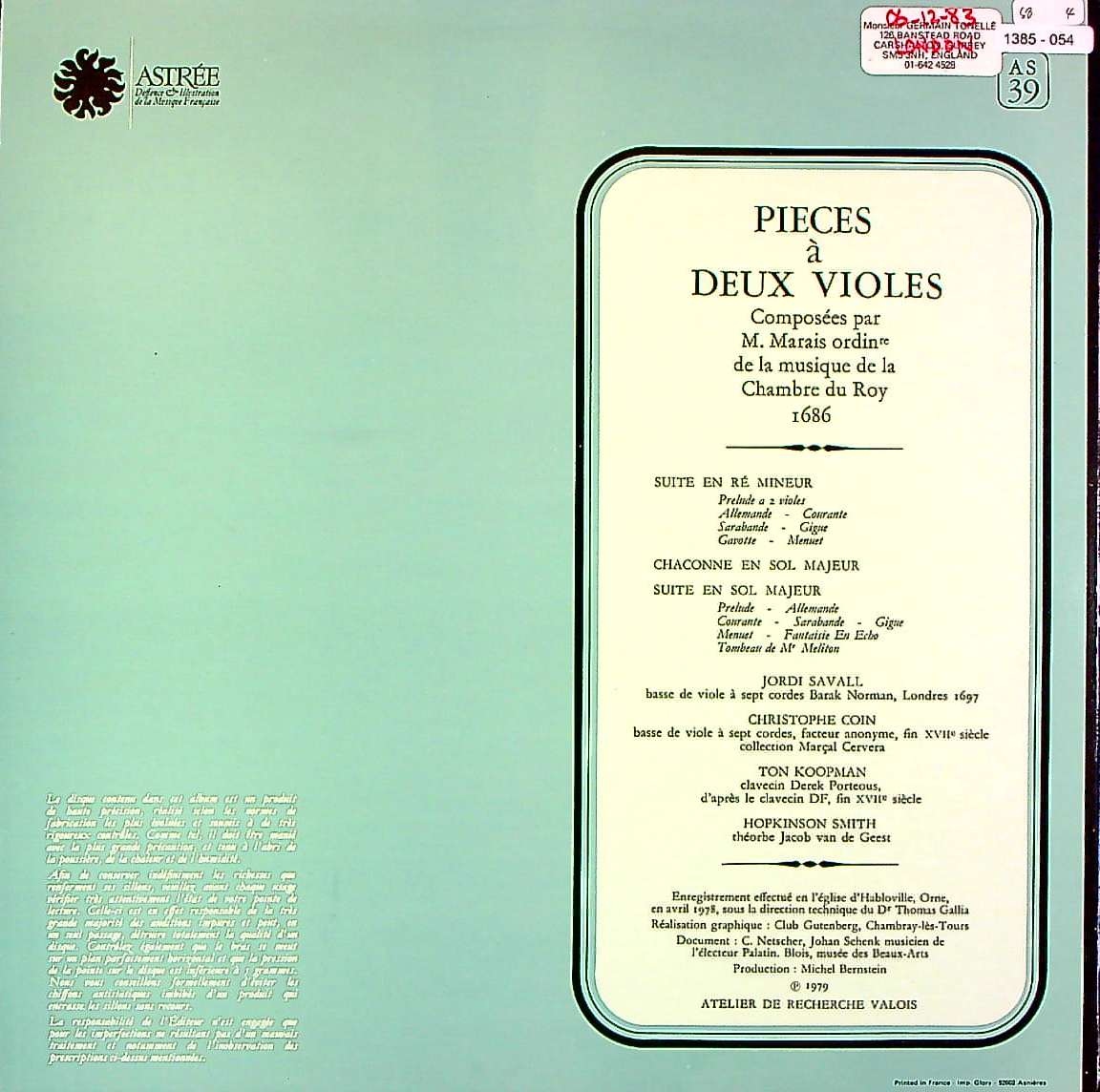 商品コード:1385-054[ASTRÉE] J.サヴァール(バス・gamb) 他/ マレ:ヴィオール曲集Vol.1/組曲ニ短調, シャコンヌ, 組曲ト長調