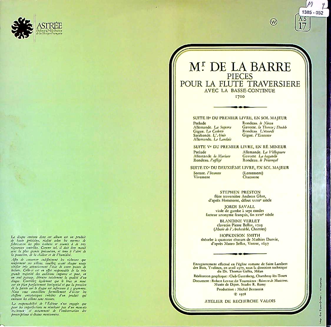 商品コード:1385-052[ASTRÉE] S.プレストン(fl) 他 / ミシェル・ドゥ・ラ・バール:組曲2番ト長調・第1巻 他