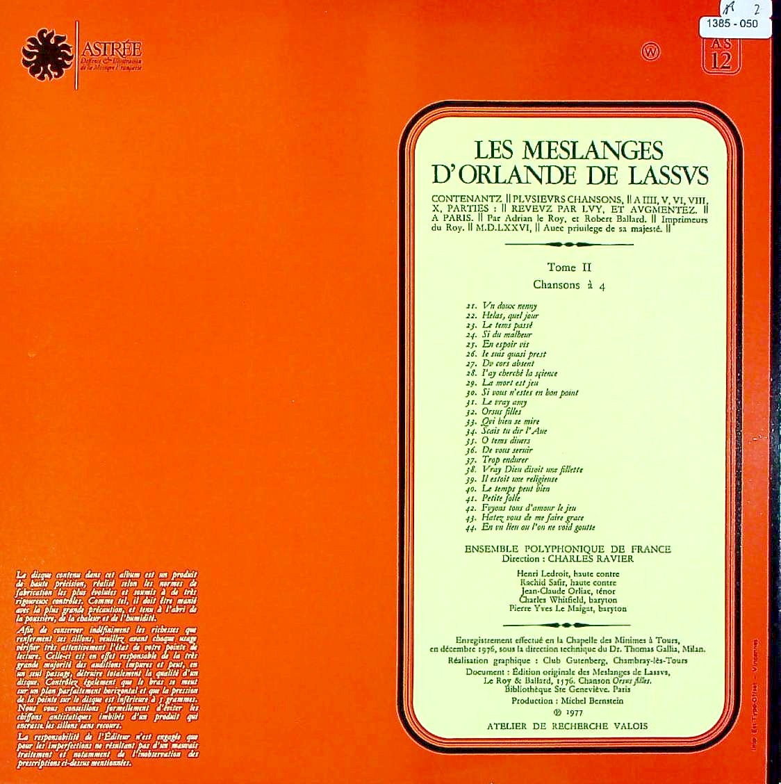 商品コード:1385-050[ASTRÉE] C.ラヴィエ指揮フランス・ポリフォニックEns. / ラッソ:4声のシャンソン曲集2巻(21~44番)