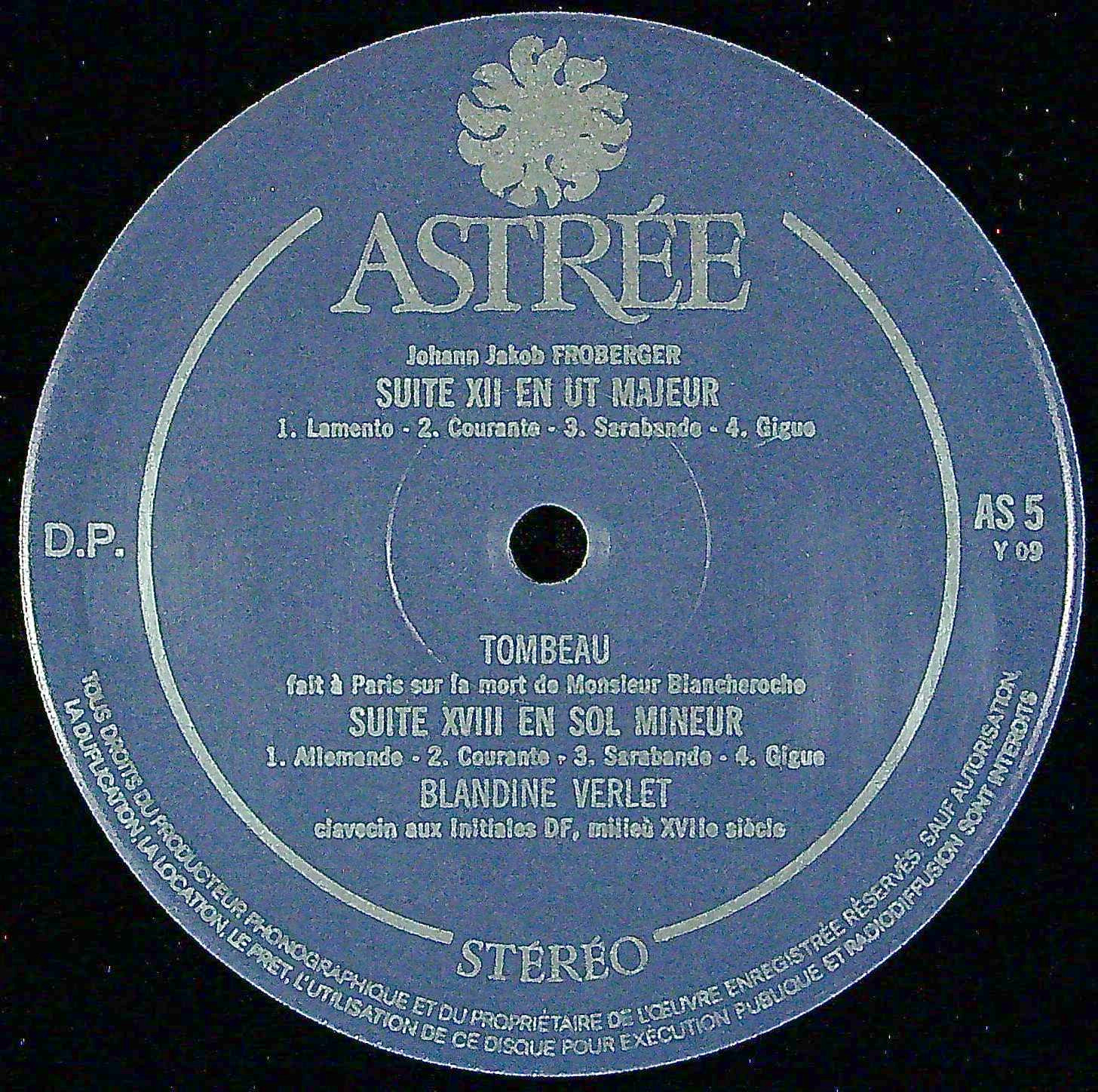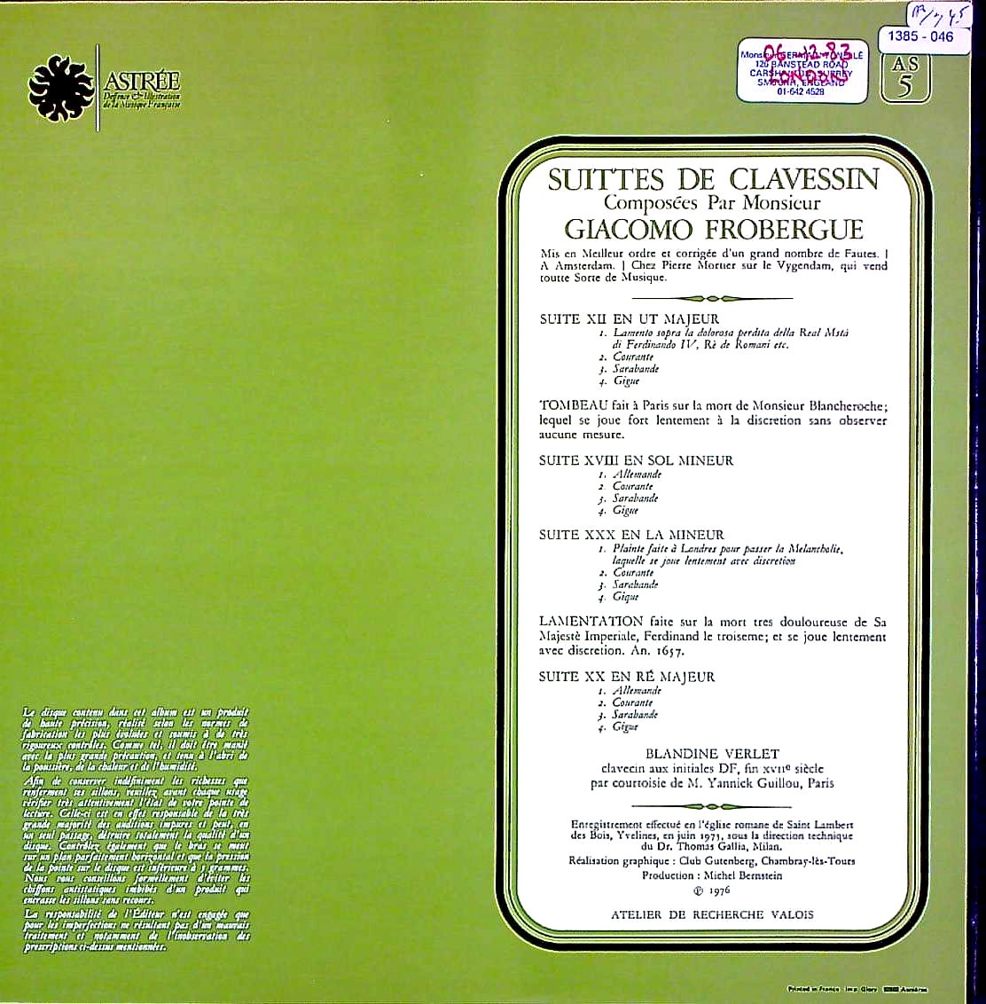 商品コード:1385-046[ASTRÉE] B.ヴェルレ(cemb) / フローベルガー:Cemb作品集/組曲(4曲), トンボー, 哀歌