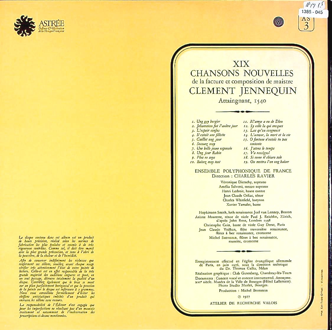 商品コード:1385-045[ASTRÉE] C.ラヴィエ指揮フランス・ポリフォニックEns.他 / ジャヌカン:シャンソン集(19曲)