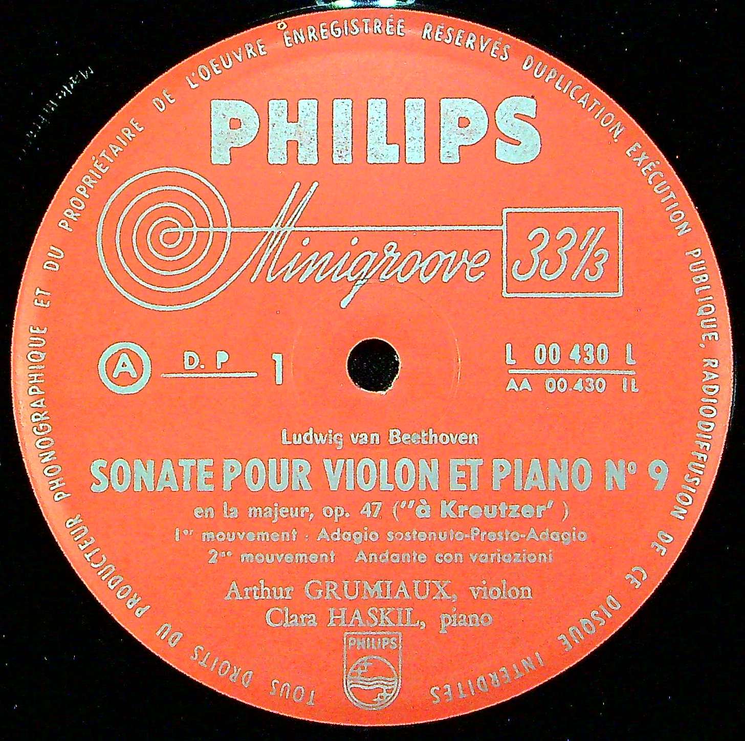 商品コード:1385-043c[PHILIPS] A.グリュミオー(vn) C.ハスキル(pf) / ベートーヴェン:Vnソナタ全集vol.4/9番Op.47「クロイツェル」, 6番Op.30-1