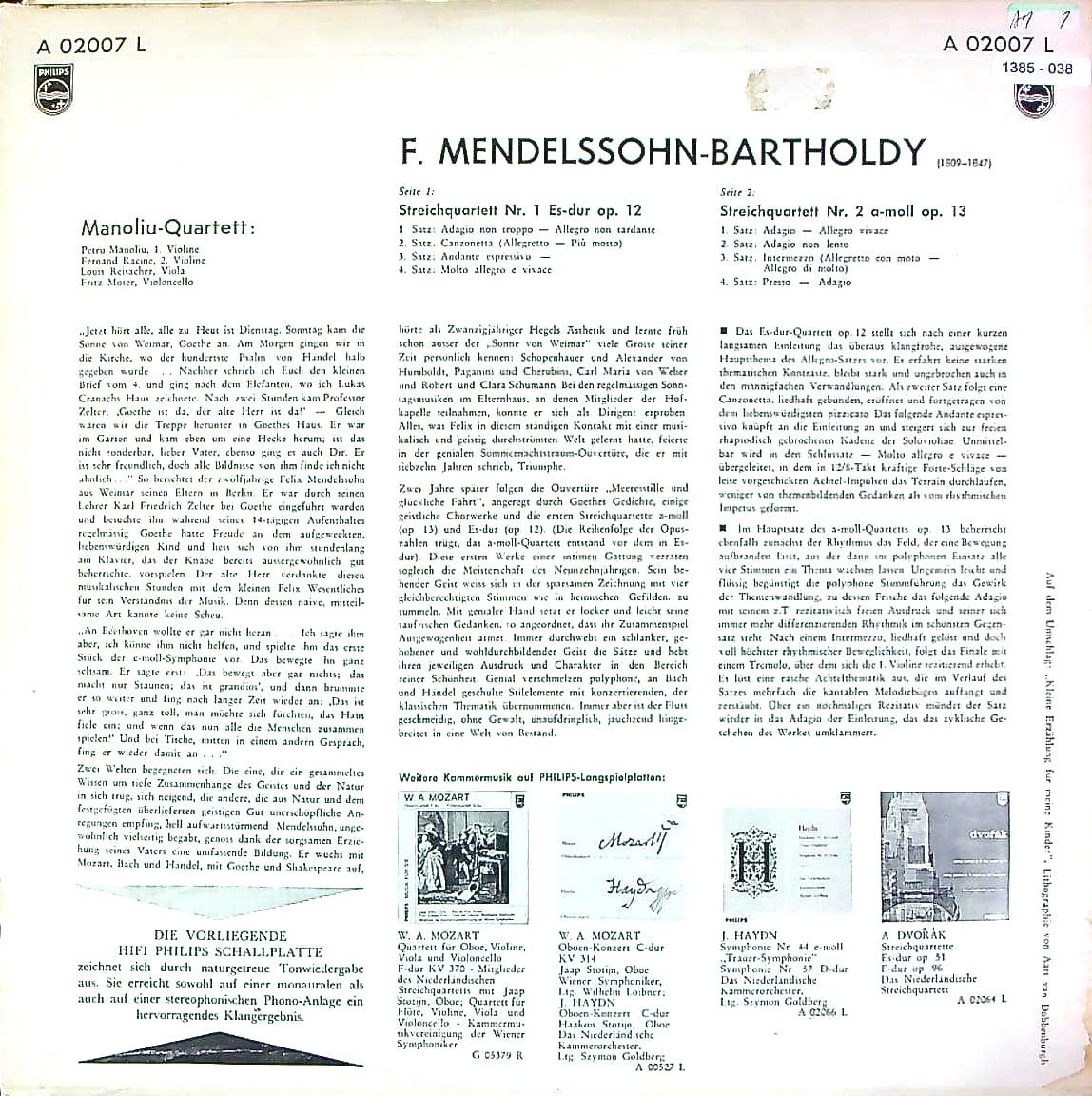 商品コード:1385-038p[PHILIPS] マノリウQt. / メンデルスゾーン:弦楽四重奏曲全集vol.1/1番Op.12, 2番Op.13