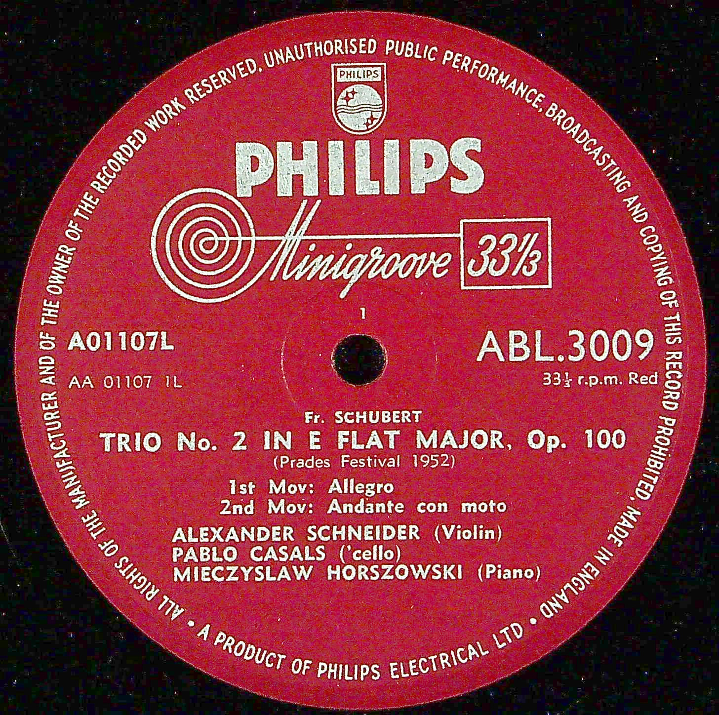 商品コード:1385-025p[PHILIPS] カザルス(vc) シュナイダー(vn) ホルショフスキ(pf) / シューベルト:Pf三重奏曲2番Op.100