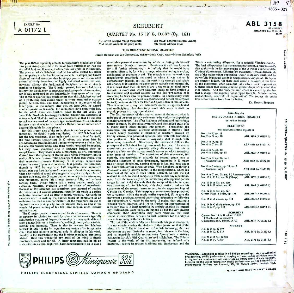商品コード:1385-021[PHILIPS] ブダペストQt. / シューベルト:弦楽四重奏曲15番D.887