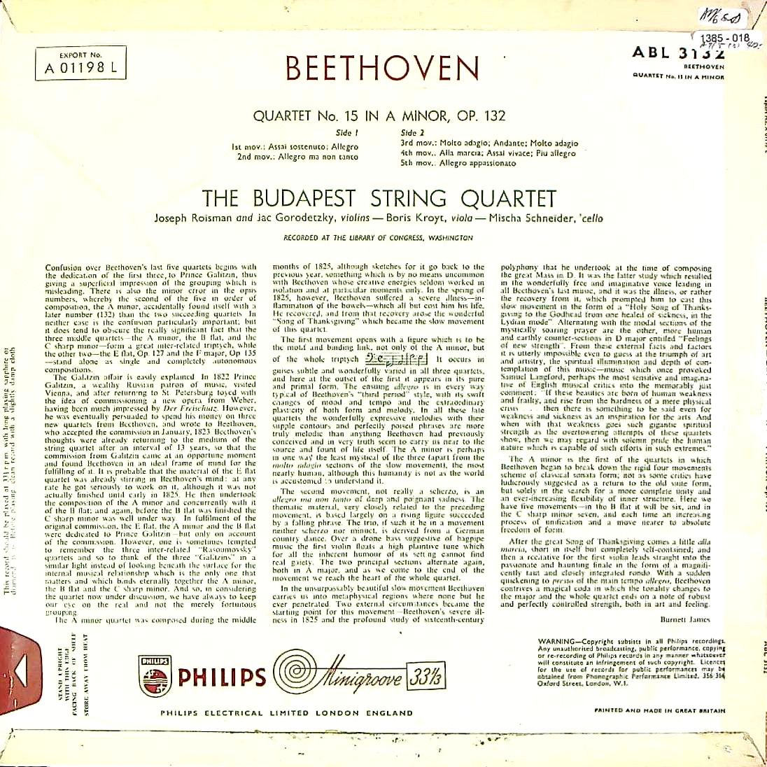 商品コード:1385-018[PHILIPS] ブダペストQt. / ベートーヴェン:弦楽四重奏曲全集(16曲)(モノラル初回)