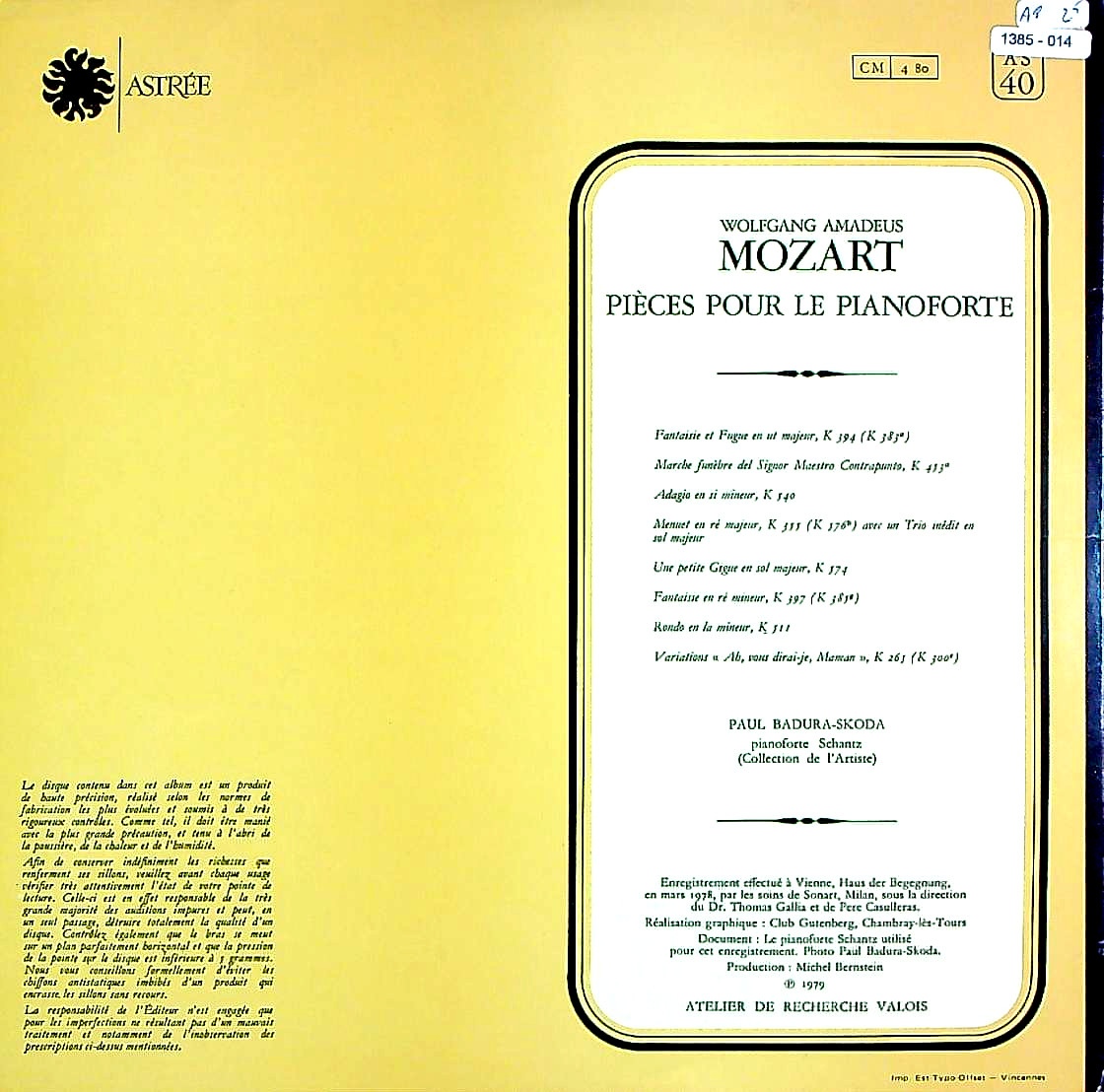 商品コード:1385-014[ASTRÉE] P.バドゥラ・スコダ(hf) / モーツァルト:幻想曲とフーガK.394, 葬送行進曲K.453a, アダージョK.540 他