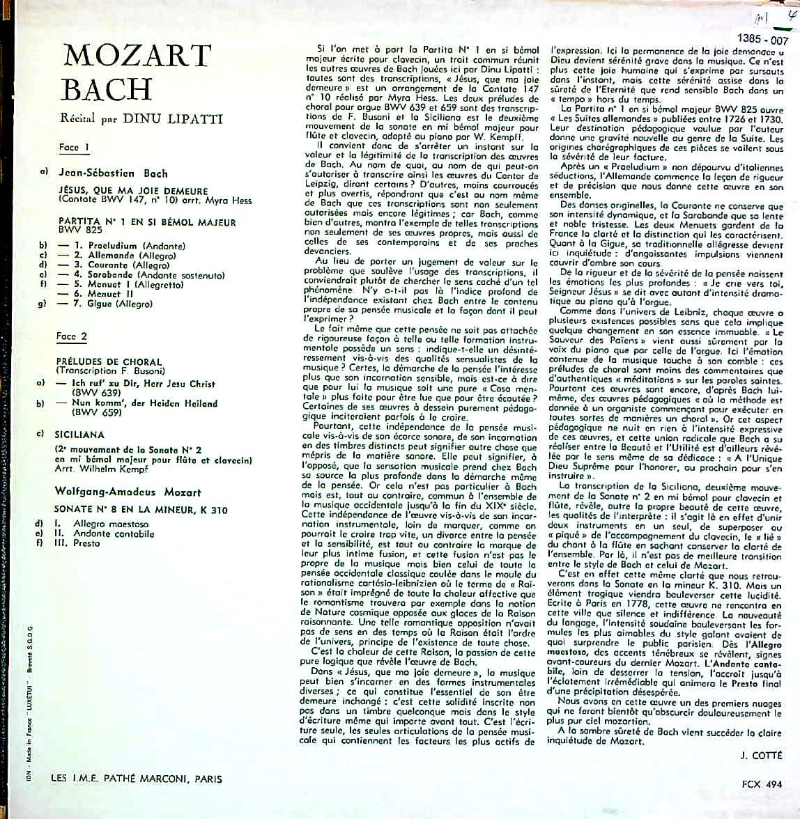 商品コード:1385-007[COLUMBIA] D.リパッティ(pf) / バッハ:主よ、人の望みの喜びよBWV.147, パルティータ1番BWV.825 他, モーツァルト:Pfソナタ8番K.310