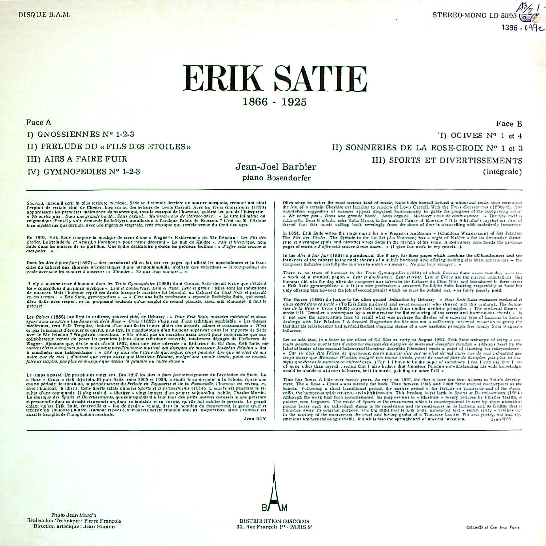 商品コード:1386-049c[BAM] J.J.バルビエ(pf) / サティ:Pf作品集vol.1/3つのグノシエンヌ, 冷たい小品, , 3つのジムノペディ), スポーツと気晴らし 他