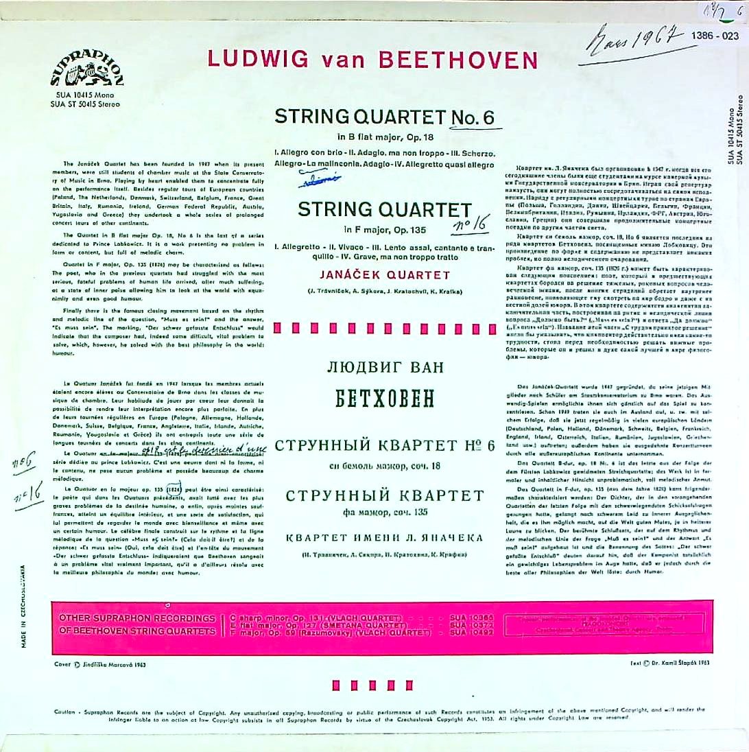 商品コード:1386-023[SUPRAPHON] ヤナーチェクQt. / ベートーヴェン:弦楽四重奏曲集/6番Op.18-6, 16番Op.135