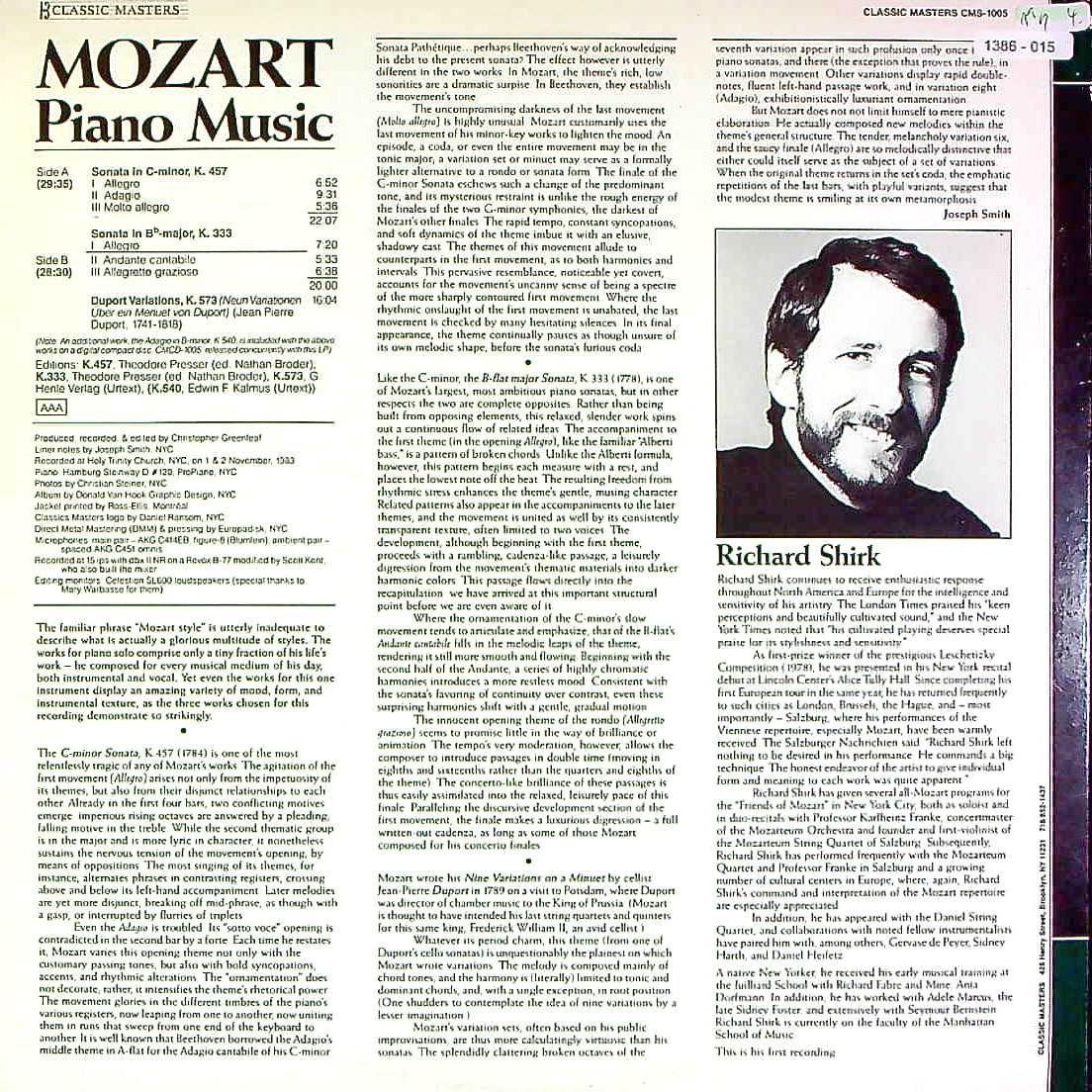 商品コード:1386-015p[CMS] R.シャーク(pf) / モーツァルト:Pfソナタ14番K.457, Pfソナタ13番K.333, 9つの変奏曲K.573