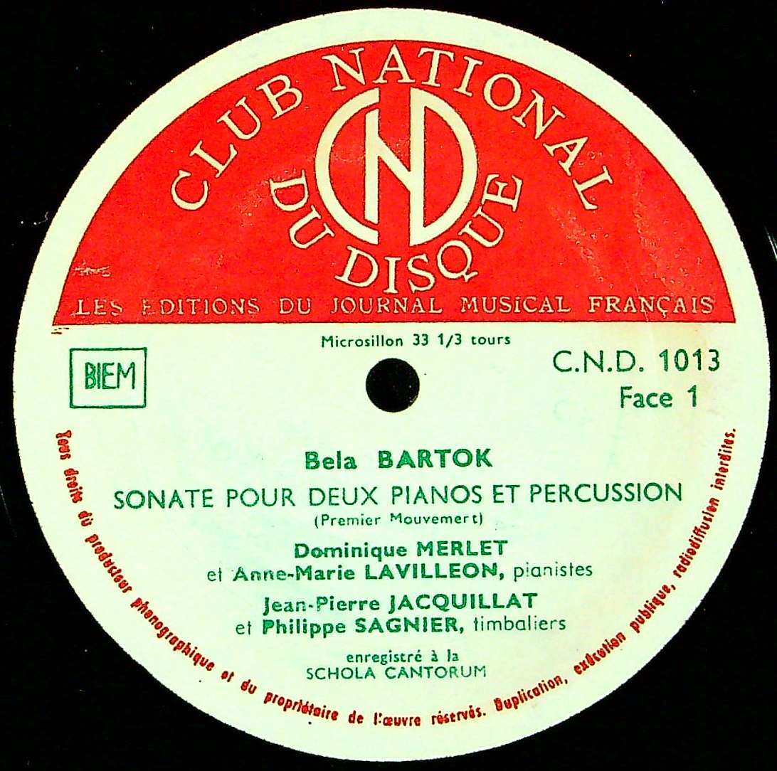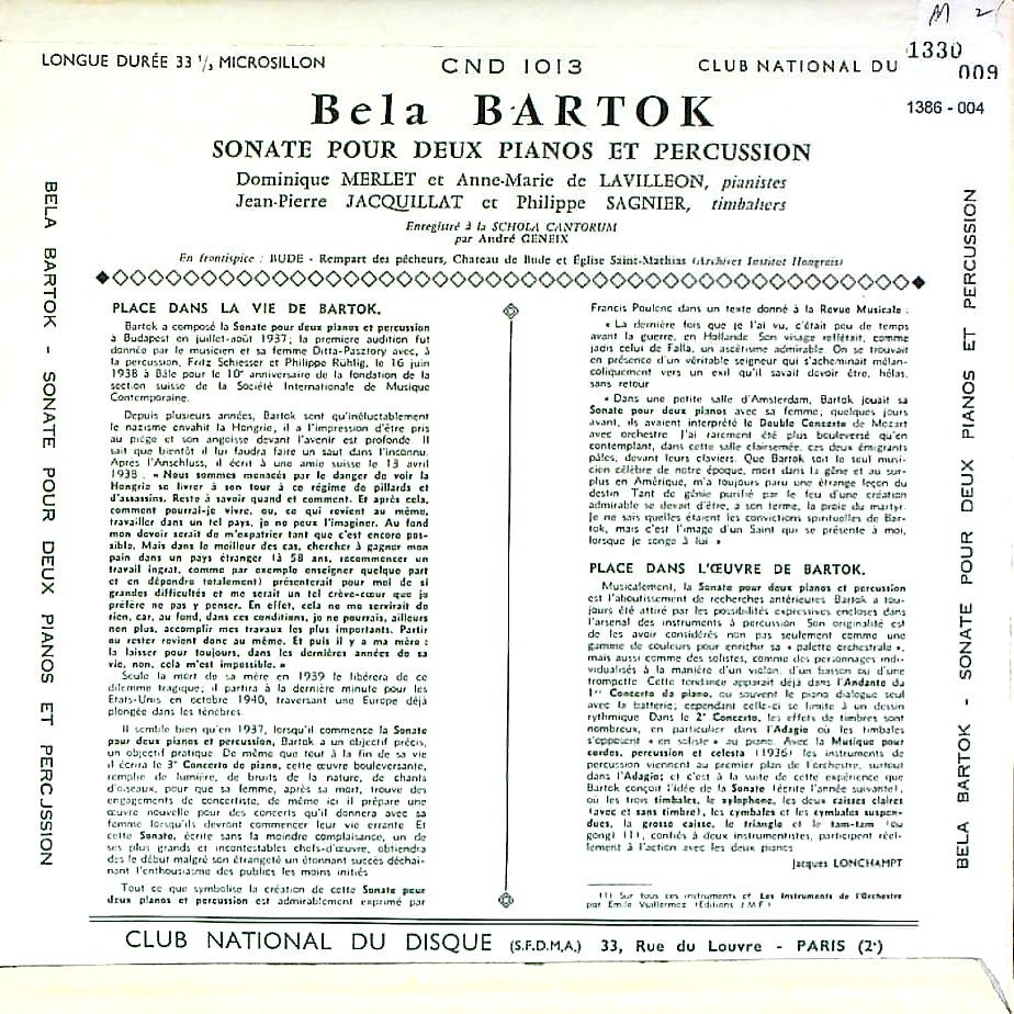 商品コード:1386-004[CLUB NATIONAL] D.メルレ, A-M.de.ラヴィレオン(pf) 他 / バルトーク:2Pfと打楽器のためのソナタSz.110