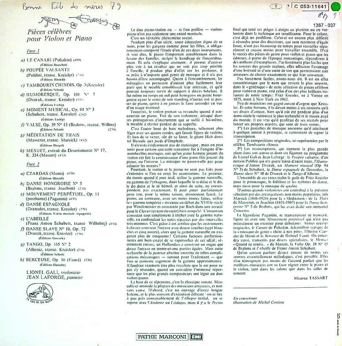 商品詳細:1972年初出の珍しいVn小品集。全16曲入り。'70年代に入って、このような企画は多くない。ピアノのラフォルジュはCNDレーベル等で有名なピアニストだが、Vnのガリは今まで聞いたことのない人。リオネル・ガリと同じ名のヴァイオリニストがBlue Noteに録音を残しており、Jazz系の人なのかも知れない。JAZZ界にもグラッペリのように優れたVnはいる。同一人物なのか不明だがパリ器楽グループのメンバーであったことは解かっている。パリ器楽グループはおそらくJ.ラフォルジュ(pf)L.ガリ(vn)B.パスキエ(va)R.ベー(vc)の4人ではないかと思われる。日本では「新フランス音楽のエスプリ・シリーズ」とのタイトルでサン・サーンスの室内楽曲集を発売していた。1曲1曲の完成度の高さ、節回し等から、若手ではなさそうだ。Vn好きならば、絶対お薦めの一枚!1970年代録音のVn小品集としては最高ランクの内容!入荷は多くない!当LPのフランス語タイトル:「Pièces Célèbres Pour Violon & Piano」。