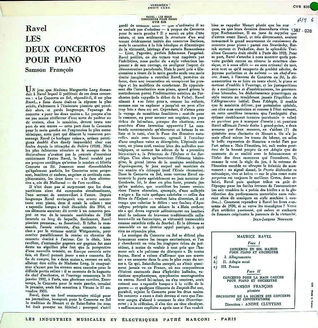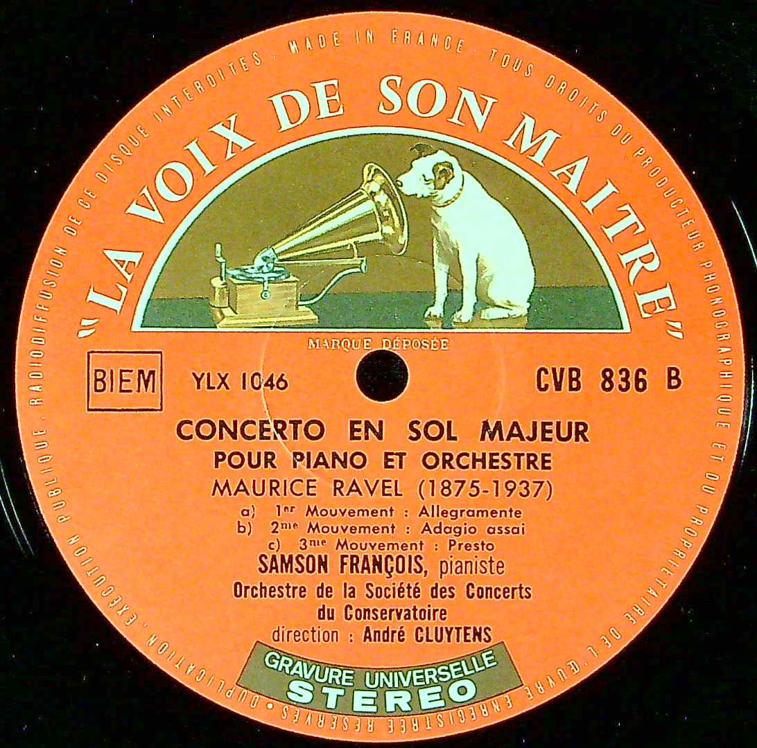 商品詳細:久しぶりの入荷になるS.フランソワ(pf)A.クリュイタンス指揮パリ音楽院o.によるラヴェル:Pf協奏曲、左手のためのPf協奏曲。仏ステレオ初出は1960年にSAXF 100番台で発売され、その後1966年頃同じ棒付ボードSAXF 836というレコード番号に変わる。1968年頃全てのフランスCOLUMBIA音源はLa Voix De Son Maîtreに統一される。統一された後は1968年頃CVB 836で発売された赤白SCニッパーレーベルがLa Voix De Son Maîtreでの最初の発売と思われる。その後1980年代まで再版される事になる名盤。改めて聴いてみてフランソワの素晴らしさを思い知らされた。ペルルミュテル、アルゲリッチ、ミケランジェリ等の名演もあるが、一つを選ぶとしたら当盤で決まりだ。文句なしの決定盤!最も有名なフランソワの録音で、ラヴェルの協奏曲の手本のような洒落っ気タップリの演奏。英国人やドイツ人が死ぬほど頑張ってもこういう演奏はできやしない。ソロだけでなくオケがクリュイタンス/パリ音楽院o.というのも成功の重要な要素だろう。きっちりしていてはラヴェルではない。砕けすぎては一時の共感のみで終わる。自由奔放なのに曲として完成度が高い。これが名演の最大のポイントだろう。二人の共演はそのバランスをしっかり押さえて、いかなる新しいスタイルをも凌駕する時代を超越した演奏である。純クラシックピアニストで曲が持つジャズ的なフィーリングをしっかり出せる人は多くない。アルコールで早死にしたフランス人天才ピアニストはフランスで最も愛された。ドイツは彼を退廃の象徴とみなしたのか1枚たりとも発売しなかった。プレスの種類は多く聴く方法は多数あるが、どうせステレオで聴くなら初出番号のSAXF 136で聴きたいが、いかんともしがたい価格となってしまった。クオリティと価格のバランスを図るならCVB 836(赤白SCニッパー中stereo段なし/小stereo段なし)がお薦めである。同じCVB 836でも1970年分からカラー切手レーベルになってしまう。そうなると価格も下がるが気分も下がるものだろう!尚モノラル盤という方法もある。