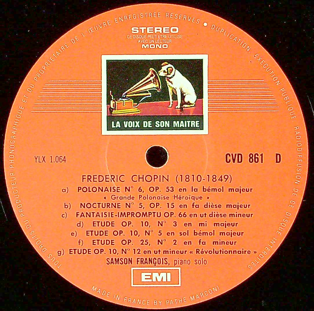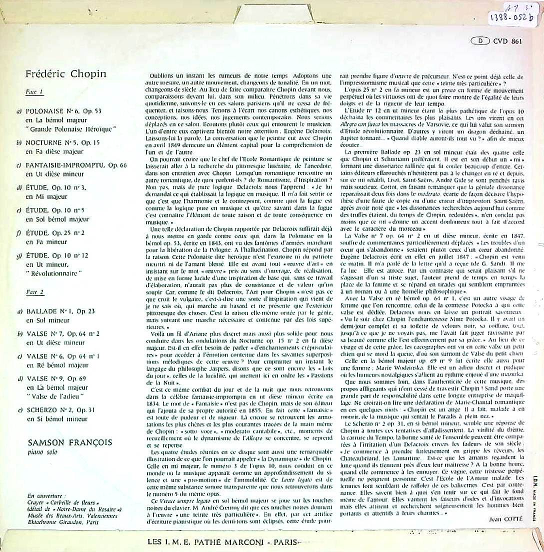 商品詳細:1960年サル・ワグラムでのショパン・リサイタル。1952年のFCX 180とは別録音。ショパン・リサイタルはこの他1964年サル・プレイエルが最後。'50年代のリサイタル盤より自由度が増しているが、それは諸刃の剣であり、自由すぎて曲が崩壊してしまう事もあったという。この録音は乗りの良さが成功しているケース。10年後の1970年、不摂生がたたり亡くなった。あまりに感性頼みのピアニスト。刹那的できらめきが随所に表れる。「Unique Récital」というタイトルでFCX 861/SAXF 181→SAXF 861→CCA 861で仏COLUMBIAから発売された。1967年頃から全ての仏COLUMBIA音源はLa Voix De Son Maîtreに統一され、CVD 861(白SCニッパー小stereo段なし)で始まると思われる。中間には様々なプレスが存在し1980年代まで再版が継続したフランソワの代表的なショパン・リサイタルである。どの盤で聴いてもタップリのフランソワらしさを味わえると確信できる録音で、まさにユニークな演奏である。カラー切手レーベルはなかなか音質は良く値段はこなれている。曲は小品12曲。彼の洒落っ気のあるタッチは、ショパンが最もわかりやすく、冒頭のポロネーズ一つとっても、これだけ軽やかに、流麗に、この重い曲をこなせるピアニストは多くない。心憎い程のスタイリッシュなショパン!尚タイトルは「Unique Récital Au Théâtre Des Champs-Elysées」だが録音はシャンゼリゼ劇場ではなくサル・ワグラム(Salle Wagram)であるので注意。この録音は毎年のようにプレスが繰り返された人気盤でプレスの種類が非常に多い番号である。当社ではプレス世代で価格を調整しており、それなりの金額としている。プレスを全て把握しているから出来る安心な価格である。フランソワのショパンを何か1枚とお考えなら当録音をお勧めする!プレスの種類は多いが年代別に価格を反映している。