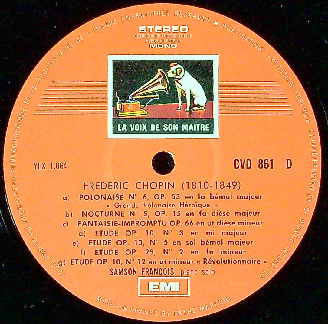 商品詳細:1960年サル・ワグラムでのショパン・リサイタル。1952年のFCX 180とは別録音。ショパン・リサイタルはこの他1964年サル・プレイエルが最後。'50年代のリサイタル盤より自由度が増しているが、それは諸刃の剣であり、自由すぎて曲が崩壊してしまう事もあったという。この録音は乗りの良さが成功しているケース。10年後の1970年、不摂生がたたり亡くなった。あまりに感性頼みのピアニスト。刹那的できらめきが随所に表れる。「Unique Récital」というタイトルでFCX 861/SAXF 181→SAXF 861→CCA 861で仏COLUMBIAから発売された。1967年頃から全ての仏COLUMBIA音源はLa Voix De Son Maîtreに統一され、CVD 861(白SCニッパー小stereo段なし)で始まると思われる。中間には様々なプレスが存在し1980年代まで再版が継続したフランソワの代表的なショパン・リサイタルである。どの盤で聴いてもタップリのフランソワらしさを味わえると確信できる録音で、まさにユニークな演奏である。カラー切手レーベルはなかなか音質は良く値段はこなれている。曲は小品12曲。彼の洒落っ気のあるタッチは、ショパンが最もわかりやすく、冒頭のポロネーズ一つとっても、これだけ軽やかに、流麗に、この重い曲をこなせるピアニストは多くない。心憎い程のスタイリッシュなショパン!尚タイトルは「Unique Récital Au Théâtre Des Champs-Elysées」だが録音はシャンゼリゼ劇場ではなくサル・ワグラム(Salle Wagram)であるので注意。この録音は毎年のようにプレスが繰り返された人気盤でプレスの種類が非常に多い番号である。当社ではプレス世代で価格を調整しており、それなりの金額としている。プレスを全て把握しているから出来る安心な価格である。フランソワのショパンを何か1枚とお考えなら当録音をお勧めする!プレスの種類は多いが年代別に価格を反映している。