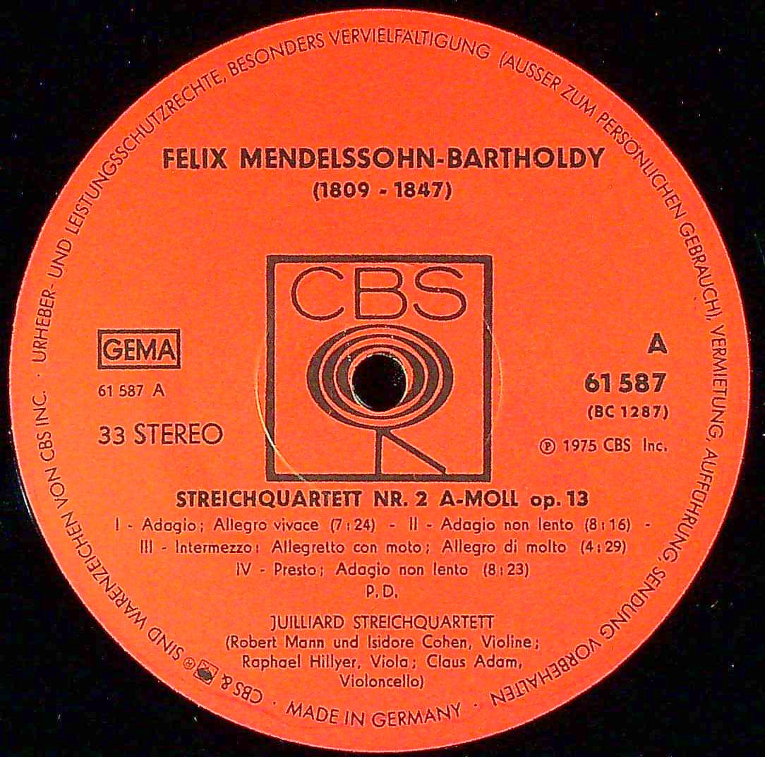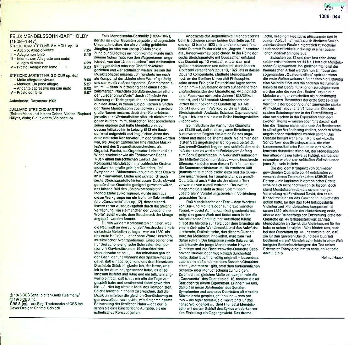 商品コード:1388-044p[CBS] ジュリアードQt. / メンデルスゾーン:弦楽四重奏曲2番Op.13, 3番Op.44-1
