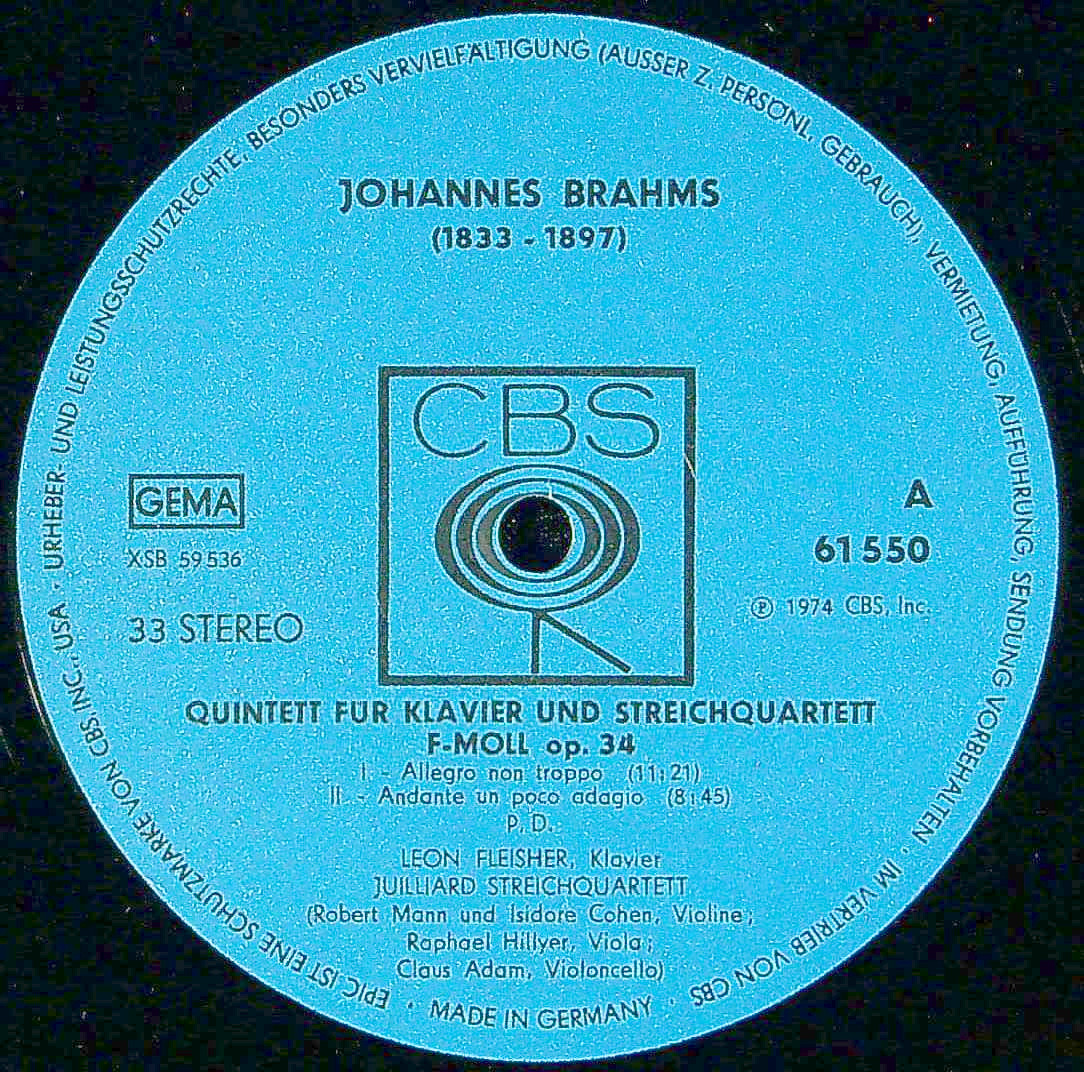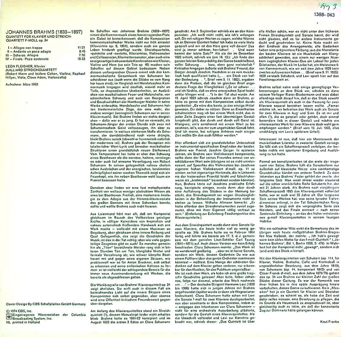 商品コード:1388-043p[CBS] L.フライシャー(pf) ジュリアードQt. / ブラームス:Pf五重奏曲Op.34