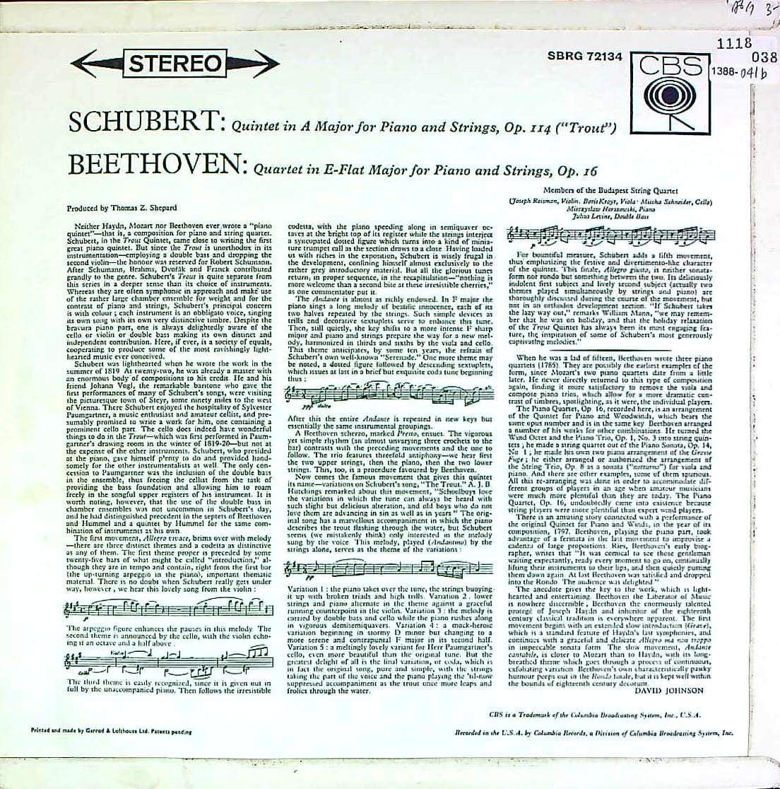 商品コード:1388-041b[CBS] M.ホルショフスキ(pf) ブダペストQt. 他/ シューベルト:Pf五重奏曲D.667 「鱒」, ベートーヴェン:Pf四重奏曲Op.16
