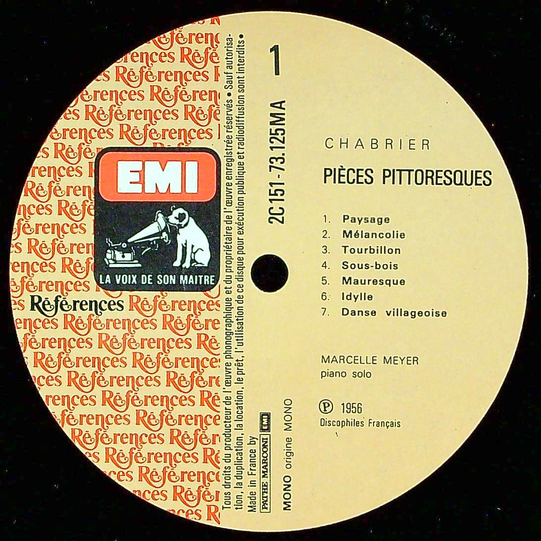 商品詳細:RéférencesシリーズのM.メイエルの音質は大変良い。オリジナルは高額な上に状態の良い盤が少ないことを考えると、安心して聴ける当盤も魅力的。シャブリエのピアノ曲の決定盤。1955年の録音ながら、目の覚めるようなタッチと洒落っ気には惚れ惚れする。これがフランス人のエスプリというものなのだろう。この復刻Référencesシリーズでは他のDF初期作品も出ており、どれもお薦め出来る内容だが、フランスでは高騰が始まっている。DFオリジナルは超高額で希少であり盤質で満足できるものは少ない。1980年代といえどもこのプレスはなかなか音質が良い。1955年の段階でここまで完成度の高い演奏が世に出てしまうと、その後に録音をしたいという動機の減退が強かったと思われる。Référencesシリーズは大変良くできたプレスでキズに悩まされず、ある程度の音質でこの名演を楽しめる優秀な再版である。これらを利用しない手はない。オリジナルと同一配置である点にもRéférencesシリーズ担当者の心意気が感じられる。Pathé社、最後の良心といって過言ではない。