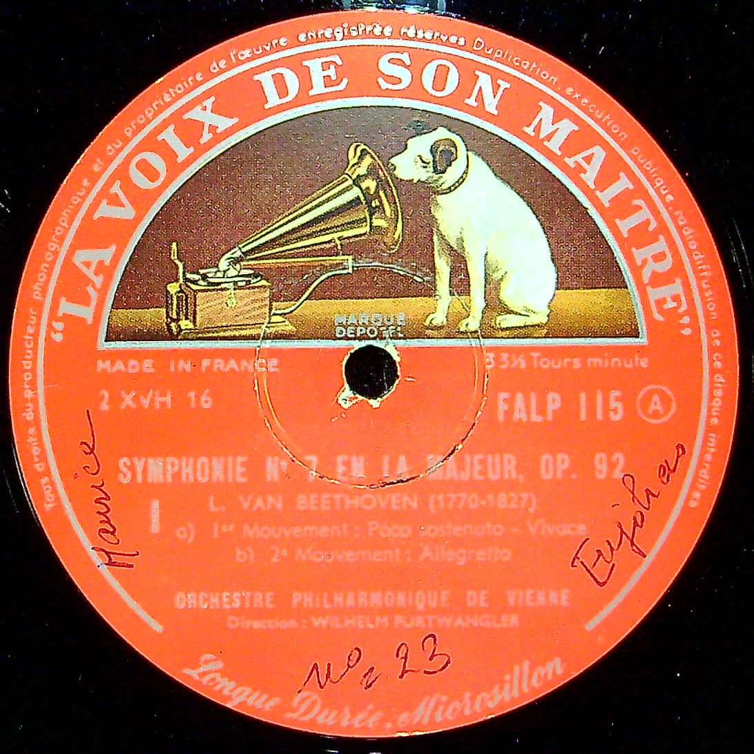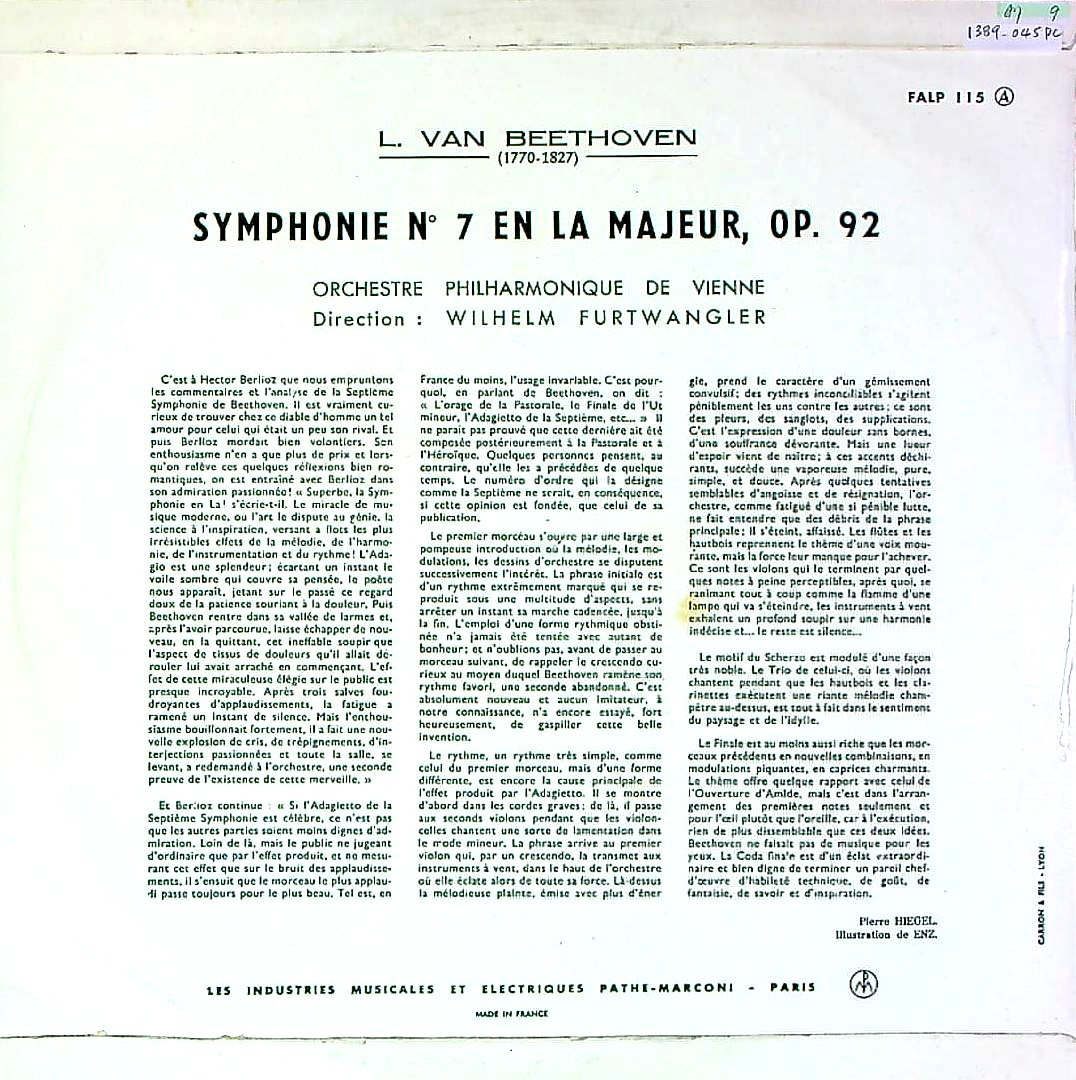 トピックス:1950年1月18-19日/25日/30-31日ウィーン・Wiener Musikverein・でのモノラル録音, 英国では1951年The Gramophone Co. Ltd.によりコピーライト登録・同年 His Master's VoiceからSPでDB 9516-20(オートマチック・12"×5)/DB 21106-10(ノーマル・12"×5)にて初リリースにて初リリース→ALP 番号は未発売, フランスでは1954年頃La Voix De Son Maître:FALP 115(銀大ニッパーツヤ内溝レーベル・フラット盤・ピンク系イラスト折返表半ツヤペラジャケット入り)にて初リリース→1955年頃同一レーベル・ピンク系イラスト折返両面コートペラジャケット入り(当アイテム)→1956年頃同一レーベル・棒付厚手ボードジャケット入り---1967年頃まで変遷する, これはフランスでの1956年頃製造のオリジナルタイプ盤が1956年頃製造の第3版の棒付厚手ボードジャケットに入るケースで初期盤!, 状態の良い盤は少ない, イタリアLa Voce Del Padrone: QALP 115, ドイツでは1954年ELECTROLA:WALP 527(金大ニッパー内溝・フラット盤・見開コロネーションジャケット入り)で初リリース, 英国でLPは未発売の為FALP 115(ドイツとともにLP最古プレス)の価値は大きい