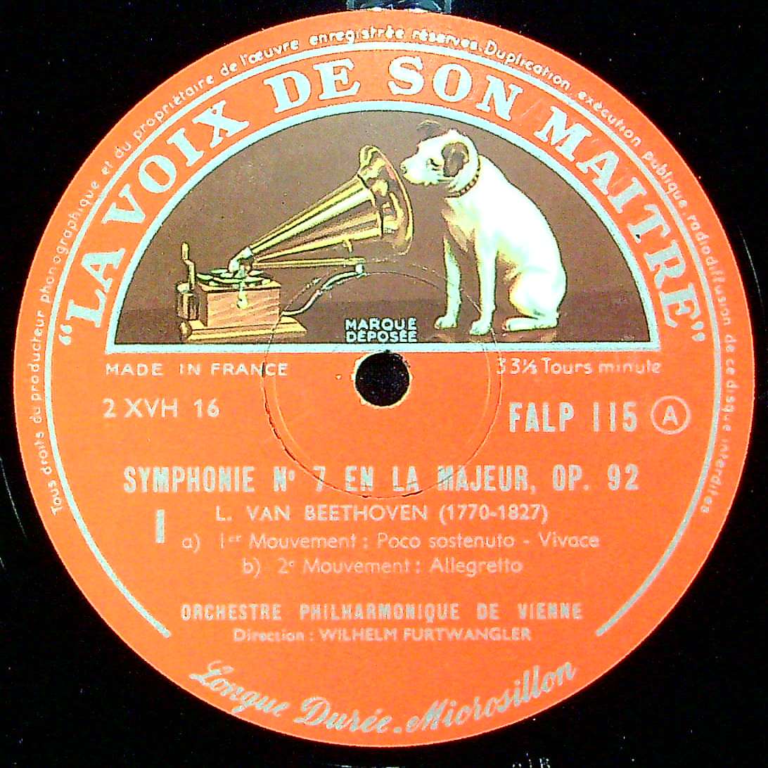 トピックス:1950年1月18-19日/25日/30-31日ウィーン・Wiener Musikverein・でのモノラル録音, 英国では1951年The Gramophone Co. Ltd.によりコピーライト登録・同年 His Master's VoiceからSPでDB 9516-20(オートマチック・12"×5)/DB 21106-10(ノーマル・12"×5)にて初リリースにて初リリース→ALP 番号は未発売, フランスでは1954年頃La Voix De Son Maître:FALP 115(銀大ニッパーツヤ内溝レーベル・フラット盤・ピンク系イラスト折返表半ツヤペラジャケット入り)にて初リリース→1955年頃同一レーベル・ピンク系イラスト折返両面コートペラジャケット入り→1956年頃同一レーベル・棒付厚手ボードジャケット入り(当アイテム)---1967年頃まで変遷する, これはフランスでの1956年頃製造のオリジナルタイプ盤が1956年頃製造の第3版の棒付厚手ボードジャケットに入るケースで初期盤!, 状態の良い盤は少ない, イタリアLa Voce Del Padrone: QALP 115, ドイツでは1954年ELECTROLA:WALP 527(金大ニッパー内溝・フラット盤・見開コロネーションジャケット入り)で初リリース, 英国でLPは未発売の為FALP 115(ドイツとともにLP最古プレス)の価値は大きい