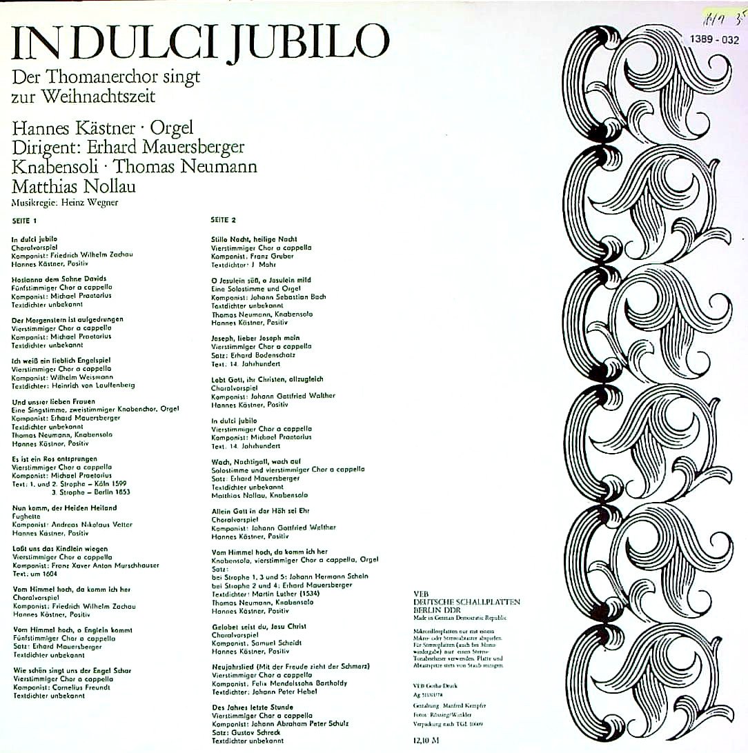 作品名:クリスマス合唱曲集/F.W.ザッハウ:見よ、主は来たり(In Dulci Jubilo), M.プレトリウス:ダビデの子にホザンナ(Hosianna Dem Sohne Davids), 同:暁の星はさし昇りて (Der Morgenstern Ist Aufgedrungen), W.ヴァイズマン: Ich Weiß Ein Lieblich Engelspiel, E.マウエスベルガー:マリア様は、いばらの道を( Und Unsrer Lieben Frauen), M.プレトリウス:エサイの根より(Es Ist Ein Ros Entsprungen), A.ニコラウス・フェッター:さあ来い、異邦人の救い主よ(Nun Komm, Der Heiden Heiland), F.クサヴァー・ムルシュハウザー:我らに御子のゆりかごを .(Laßt Uns Das Kindlein Wiegen), F.W.ザッハウ:高き天よりわれは来たれり(Vom Himmel Hoch, Da Komm Ich Her), C.フロイント:天使の群、我らに歌うや、いかに美しき(Wie Schön Singt Uns Der Engel Schar) | グルーバー:きよしこの夜(Stille Nacht, Heilige Nacht), バッハ:シェメッリ賛美歌集B.439-507~「おお、うるわしいイエス様B.493」(O Jesulein Süß, O Jesulein Mild), J.ゴットフリート・ヴァルター:汝らキリスト者よ、こぞりて主をたたえよ(Lobt Gott, Ihr Christen, Allzugleich), M.プレトリウス:もろびと声あげ(In Dulci Jubilo), M.ノラウ:起きろ、ナイチンゲール、起きろ(Wach, Nachtigall, Wach Auf), J.ゴットフリート・ヴァルター:いと高きところにいます神にのみ栄光あれ(Allein Gott In Der Höh Sei Ehr), マルティン・ルター:高き天よりわれは来たれり ( Vom Himmel Hoch, Da Komm Ich Her), S.シャイト:イエス・キリストよ、賛美をうけたまえ(Gelobet Seist Du, Jesu Christ), メンデルスゾーン:新年の歌(喜びには苦しみが伴う)(Neujahrslied (Mit Der Freude Zieht Der Schmerz)), J.アブラハム・ペーター・シュルツ:今年最後の時間(Des Jahres Letzte Stunde)
